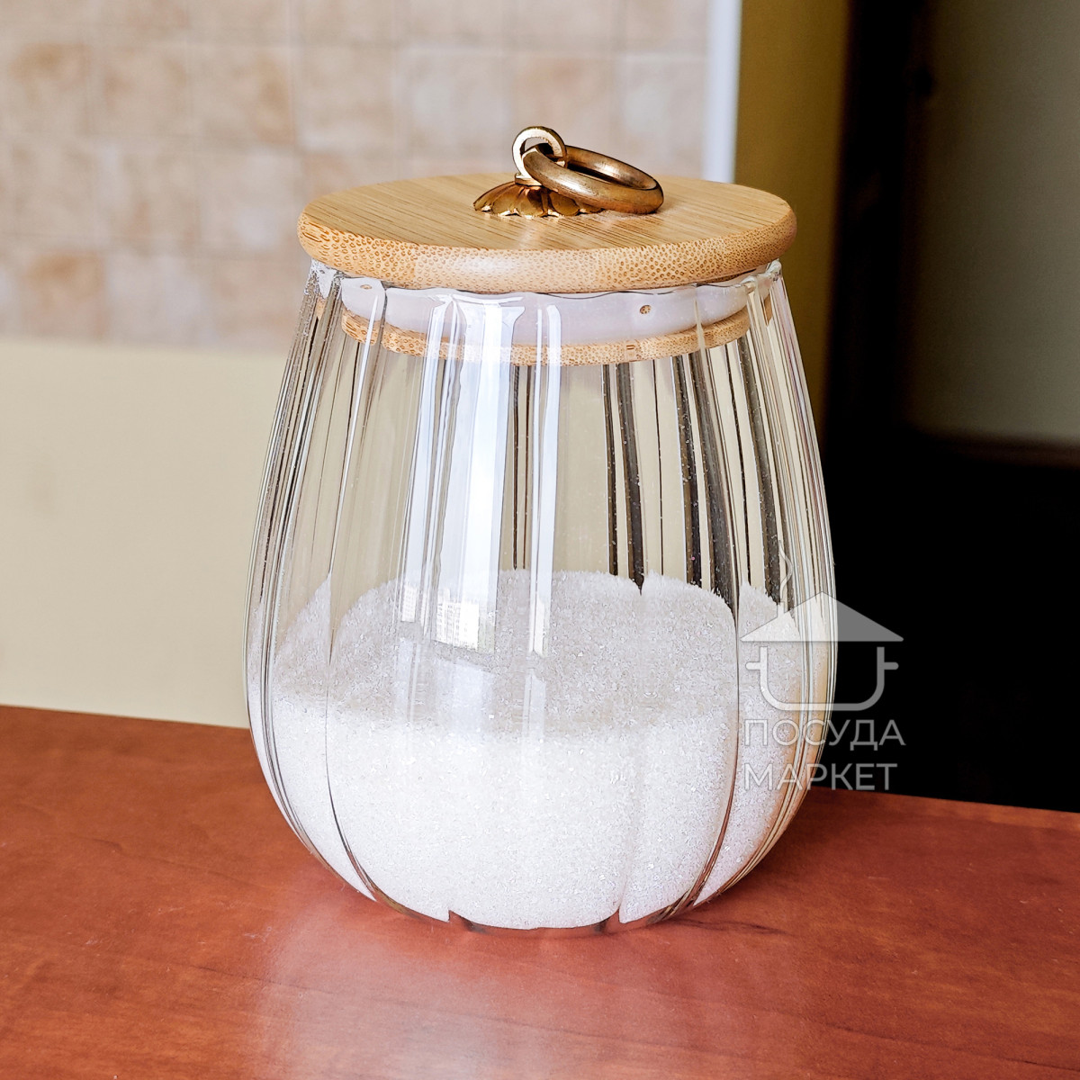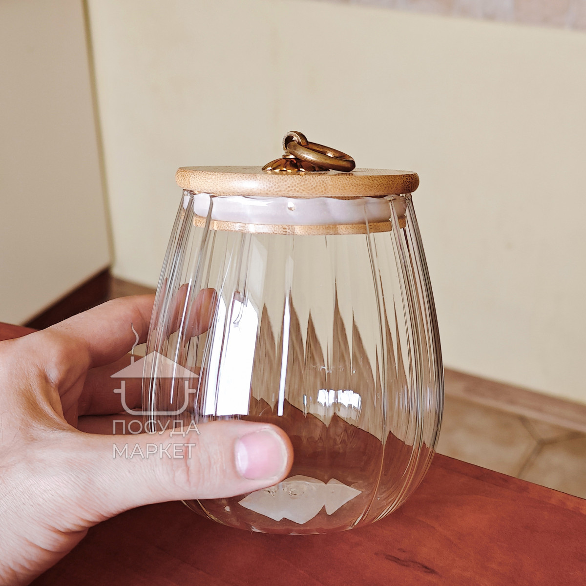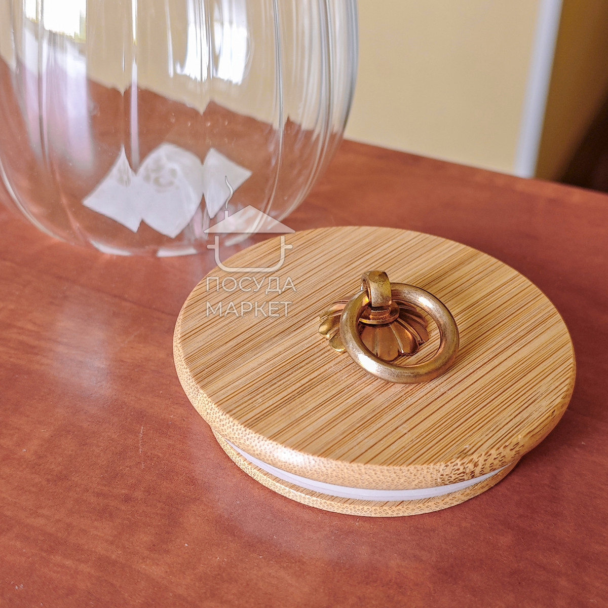 Сахарница, конфетница Frodo 700 мл с ребристым стеклом внутри и бамбуковой крышкой с кольцом