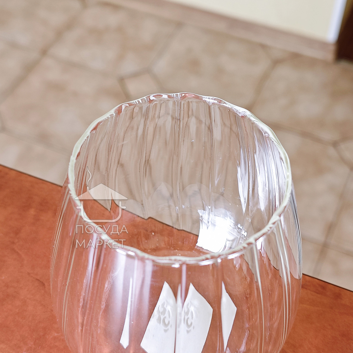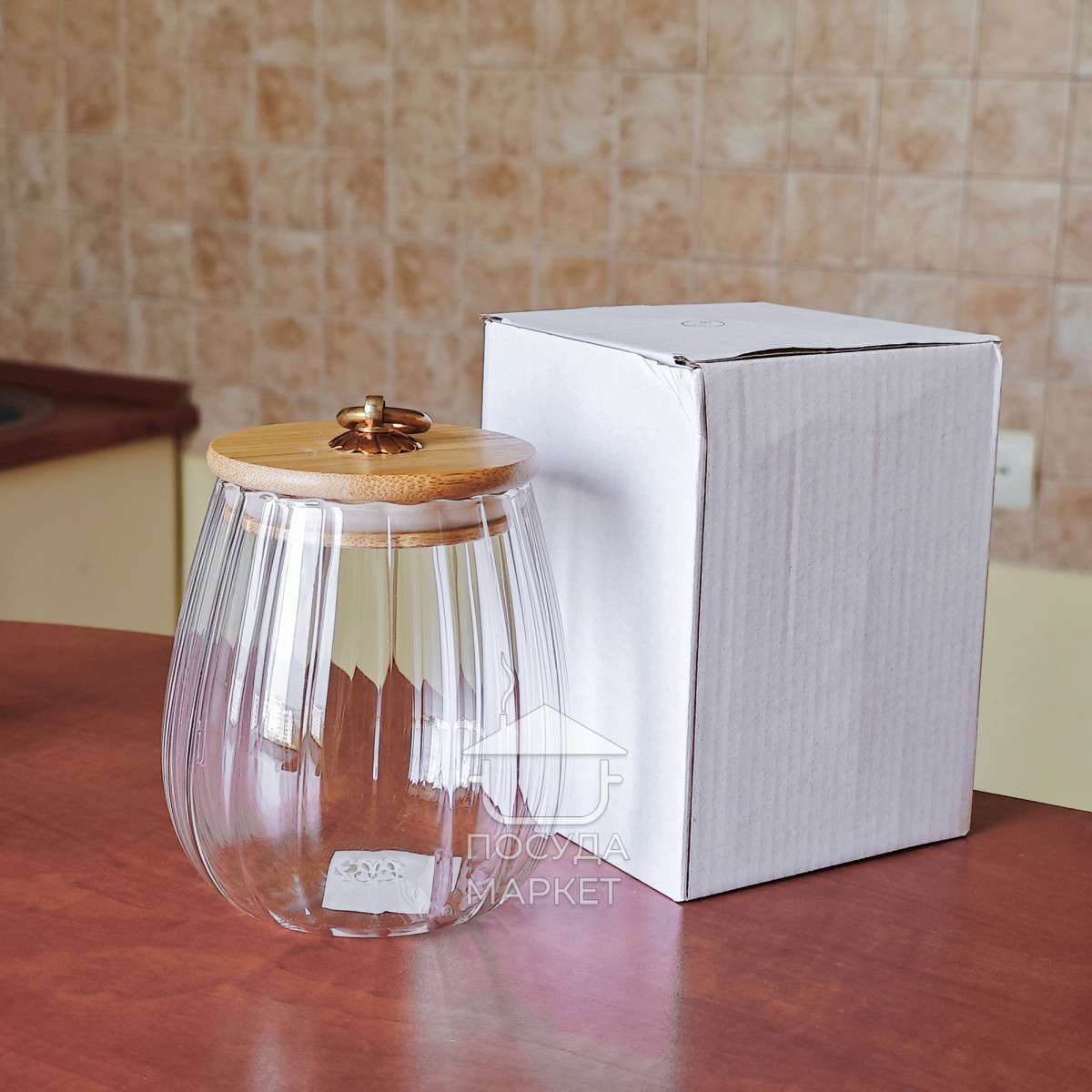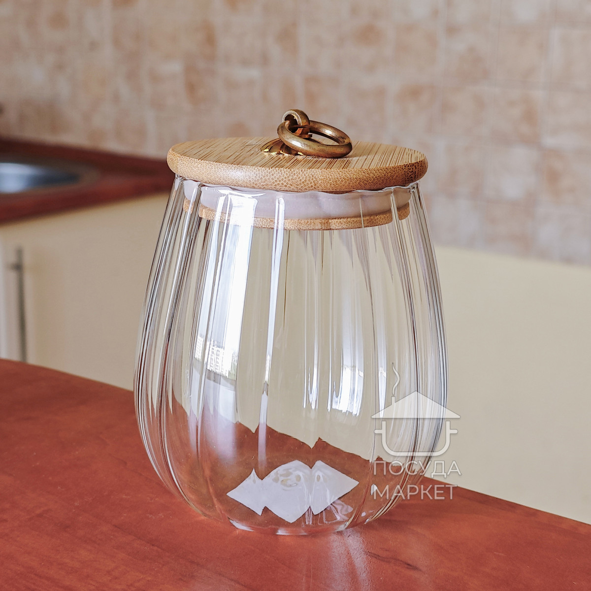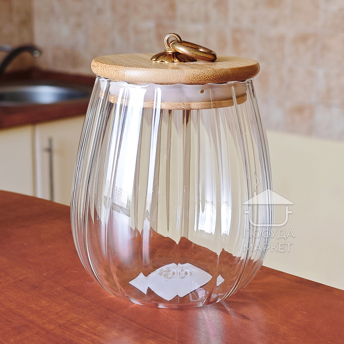 Сахарница, конфетница Frodo 700 мл с ребристым стеклом внутри и бамбуковой крышкой с кольцом