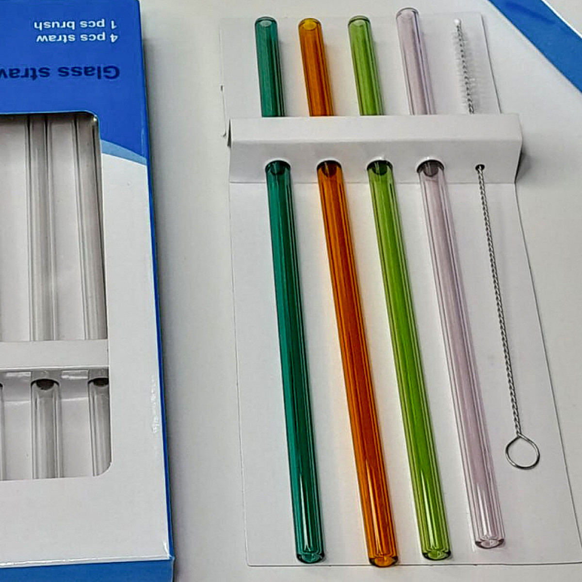 Кольорові скляні трубочки для напоїв та коктейлів - стильне та екологічне рішення. Комплект включає 4 трубочки діаметром 8 мм та довжиною 20 см, а також щітку для легкого очищення. Трубочки можна мити в посудомийній машині. Вироблено в Китаї.