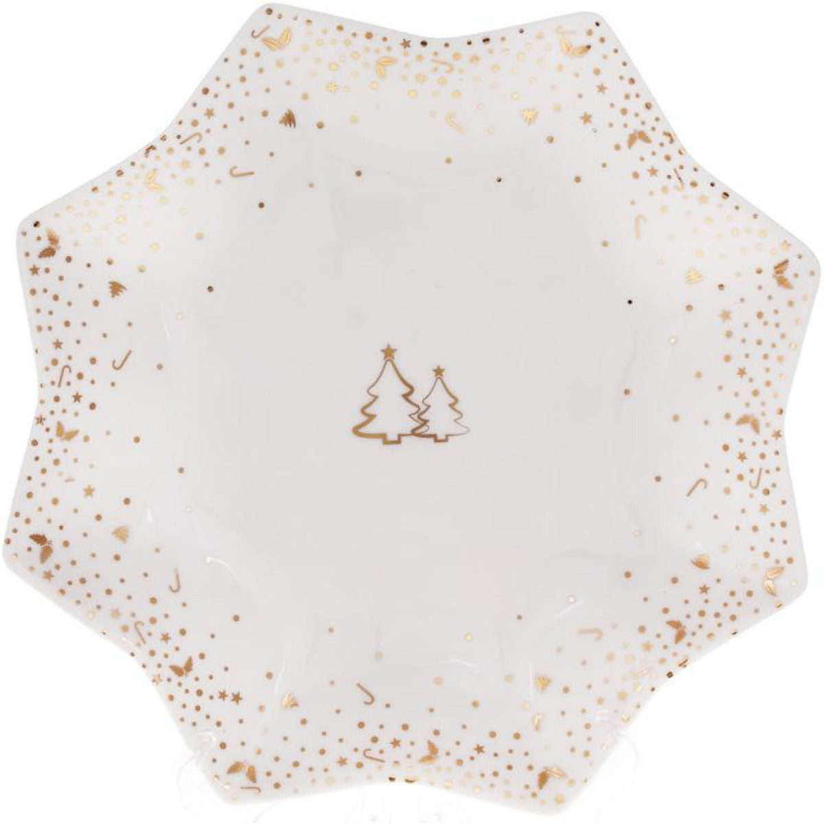 Блюдо в форме снежинки Зимняя феерия - нежная посуда для уютного зимнего стола. Диаметр: 30см. Блюдо изготовлено из белого фарфора с золотым декором новогодней тематики. Блюдо имеет форму снежинки. Оно послужит отличным подарком к Рождественским праздникам или к Новому Году. Наилучшая идея оригинального позитивного и практичного подарка в период зимней сказки.