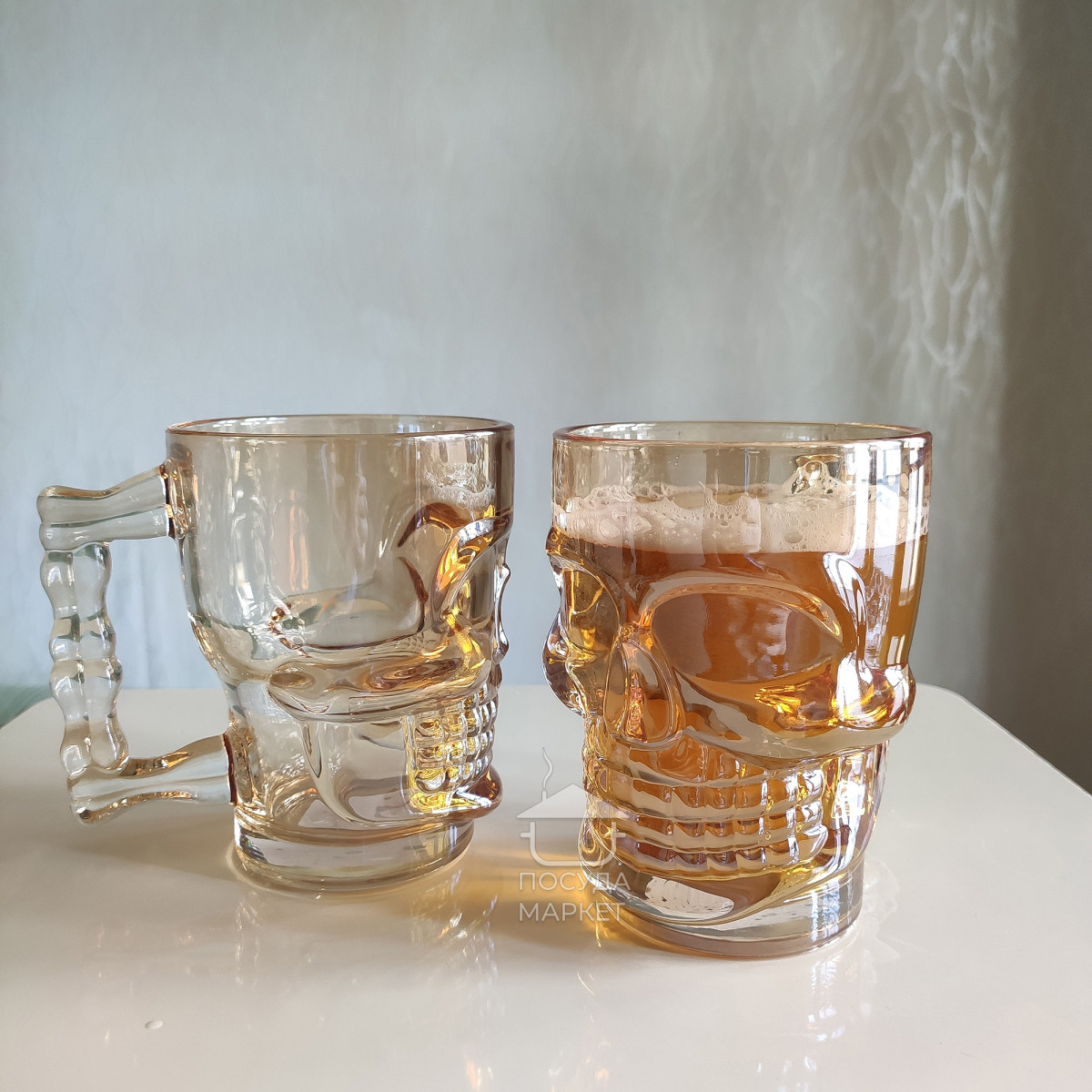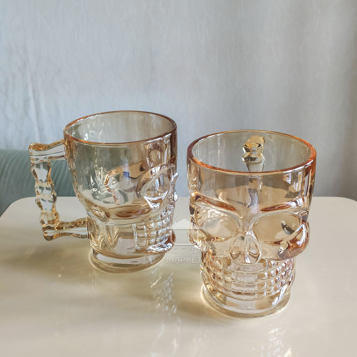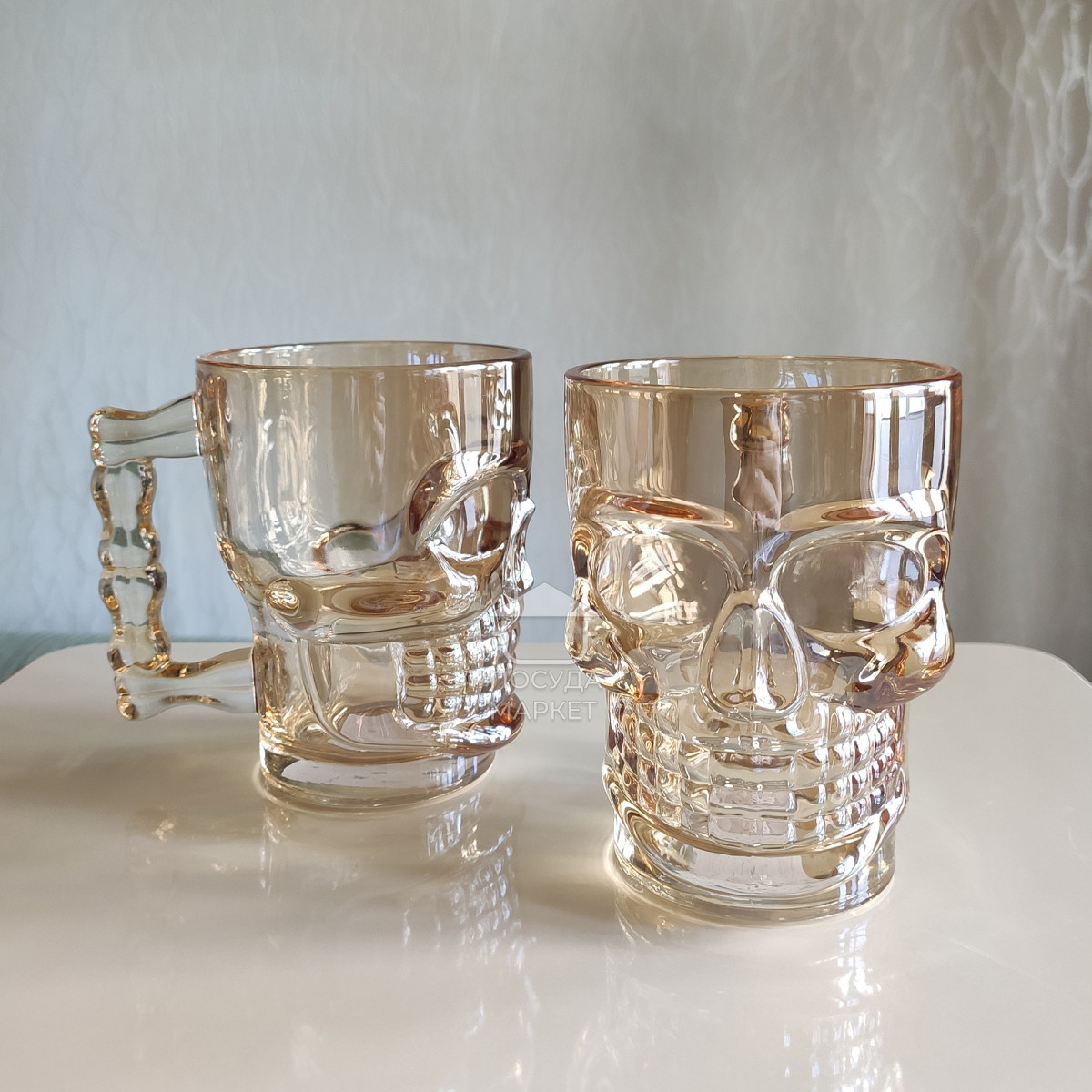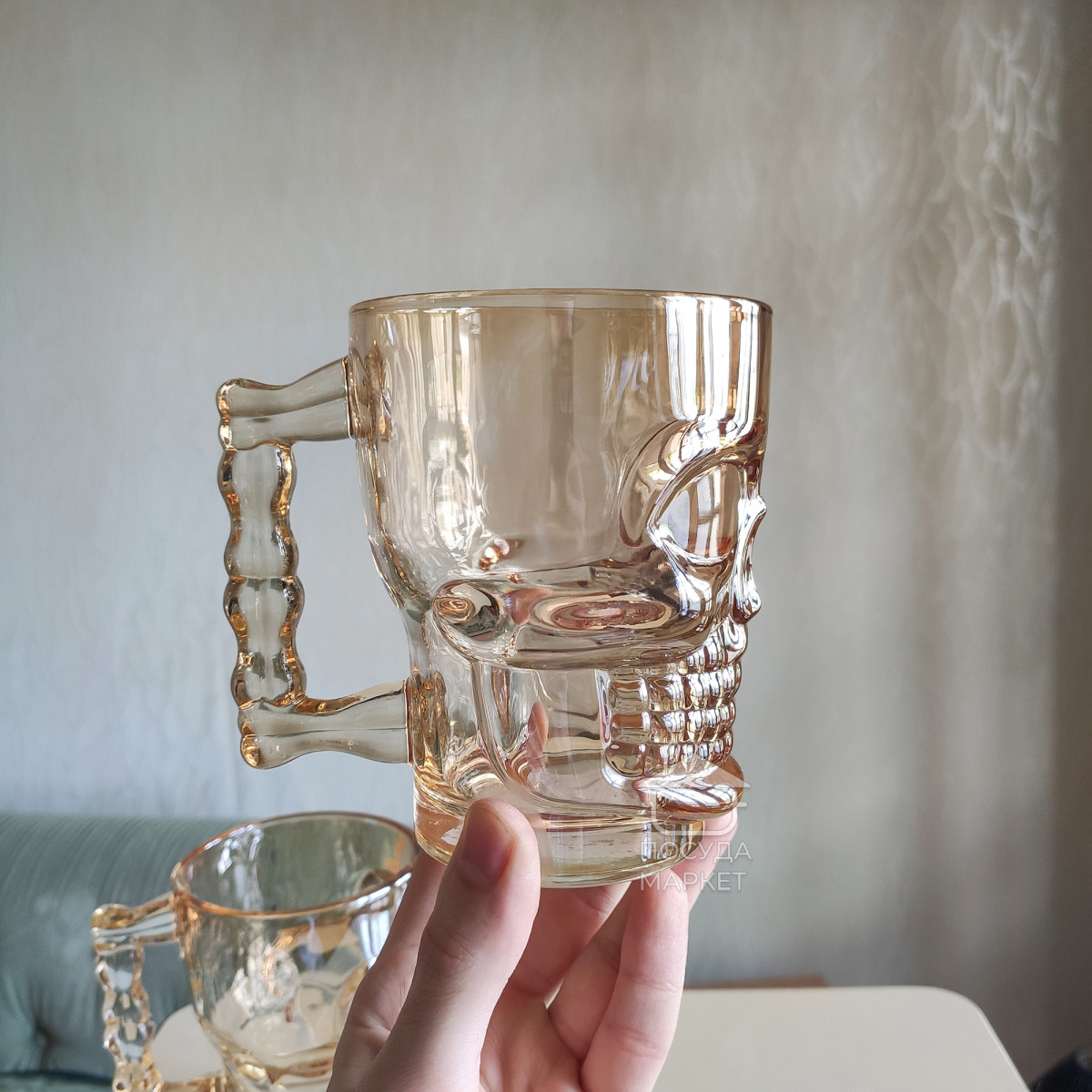 Набор 6 кружек для пива 450 мл Skull, прозрачное янтарное стекло в виде черепа