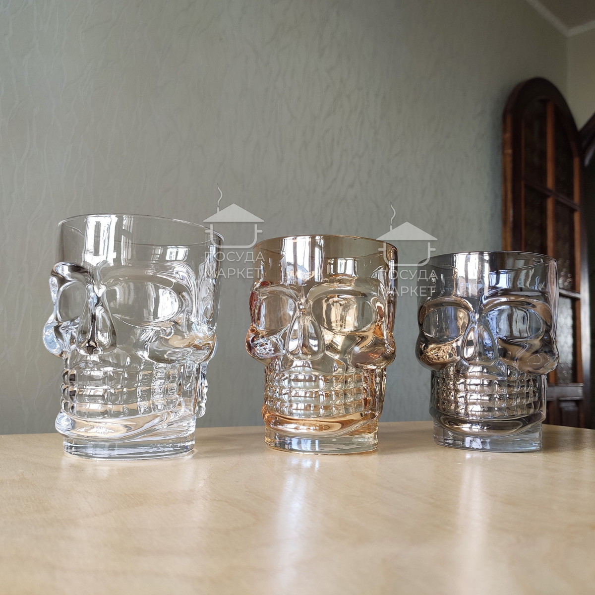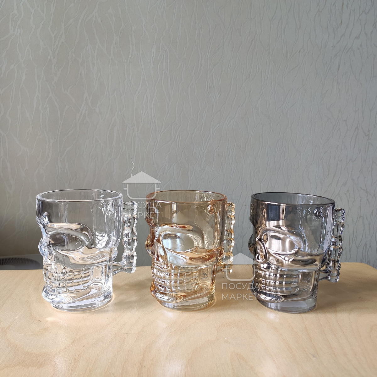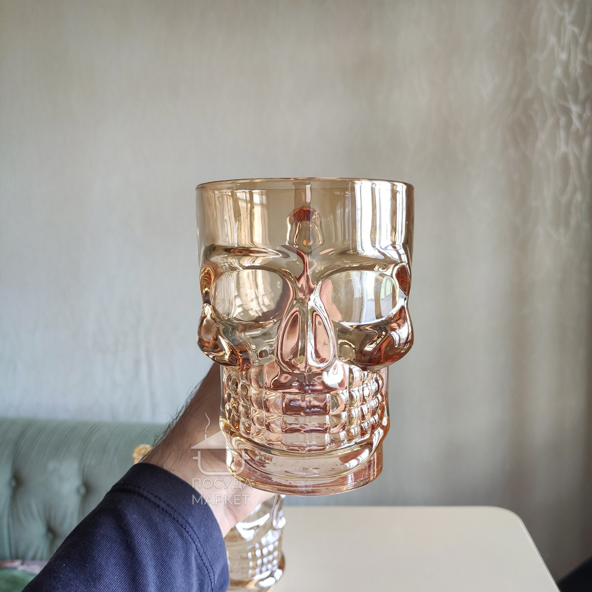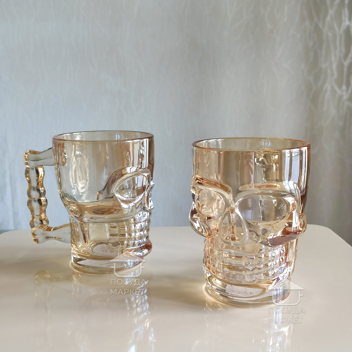 Набор 6 кружек для пива 450 мл Skull, прозрачное янтарное стекло в виде черепа