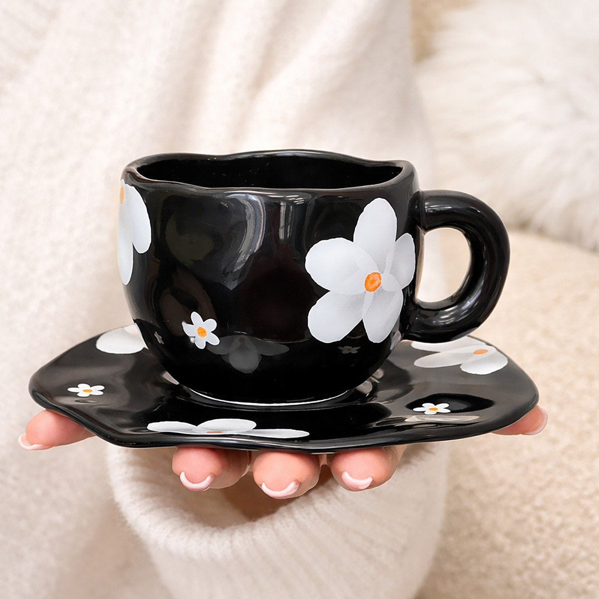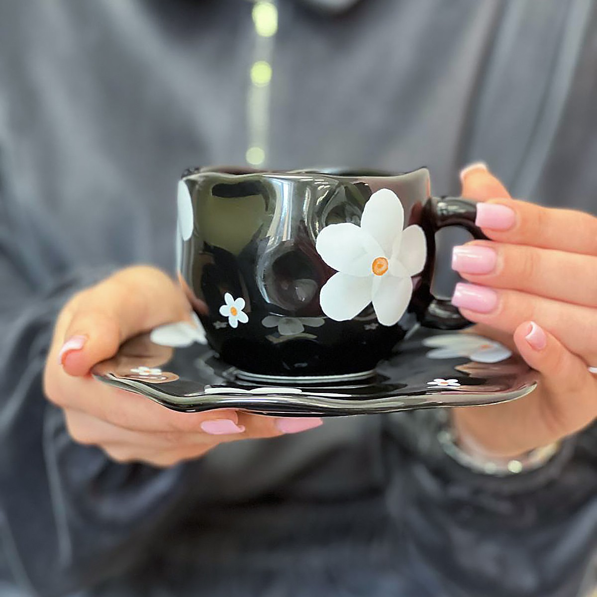 Чашка з блюдцем «Нічна квітка» — стильний та витончений набір, що привертає увагу контрастним дизайном. Глибокий чорний колір кераміки елегантно поєднується з ніжними білими квітами з теплими акцентами в середині, створюючи ефектну та сучасну композицію.