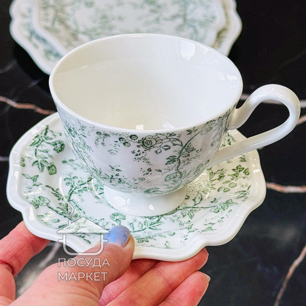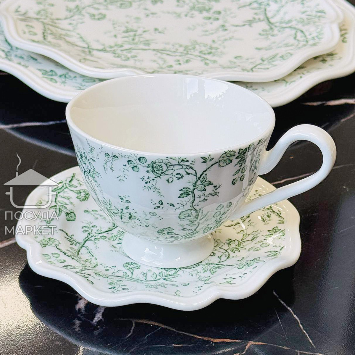 Чашка з блюдцем порцелянова 190 мл Meadow Grace, біла з зеленим