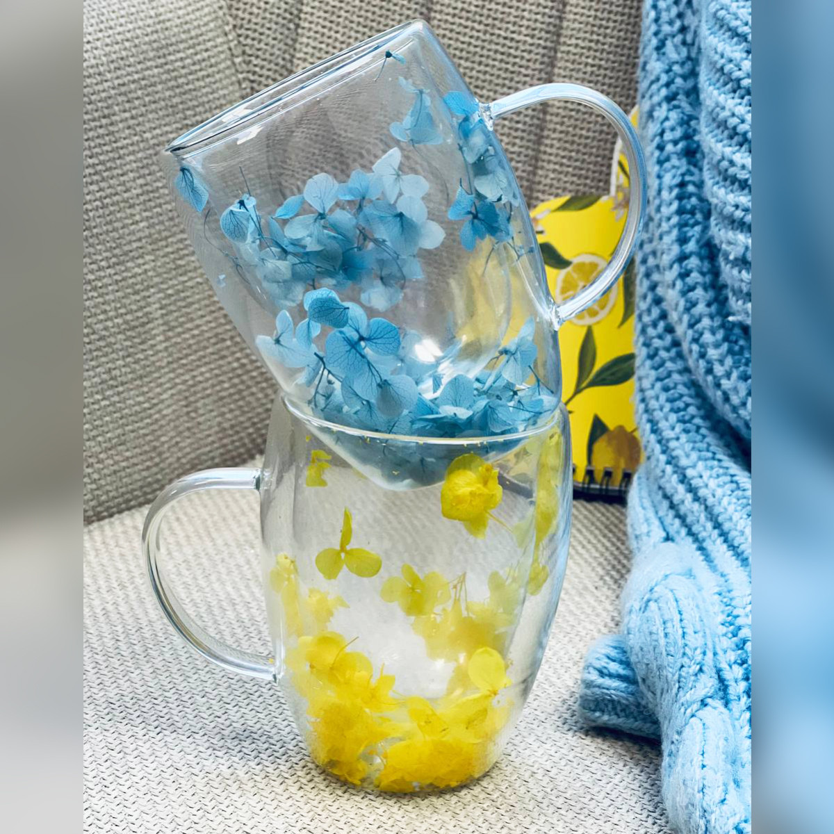Особливого шарму кухлю додає декор із яскравих жовтих пелюсток, який виглядає свіжо та сонячно, наповнюючи кожне чаювання теплом і позитивним настроєм. Прозоре скло підкреслює колір напою та створює ефектну подачу.