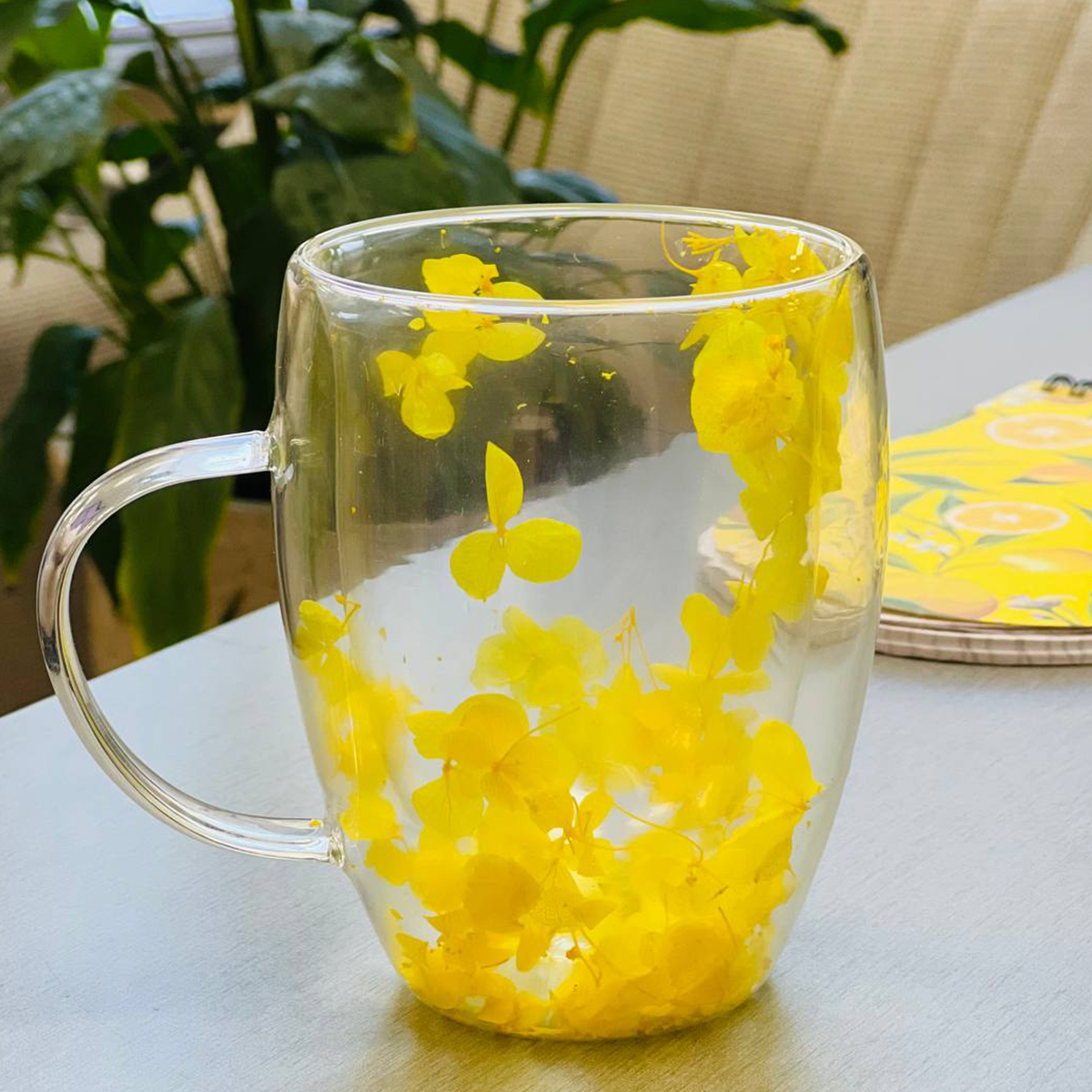 Чашка з подвійними стінками 350 мл Flora Glass 2, скляний кухоль з квітковим декором жовтих пелюсток