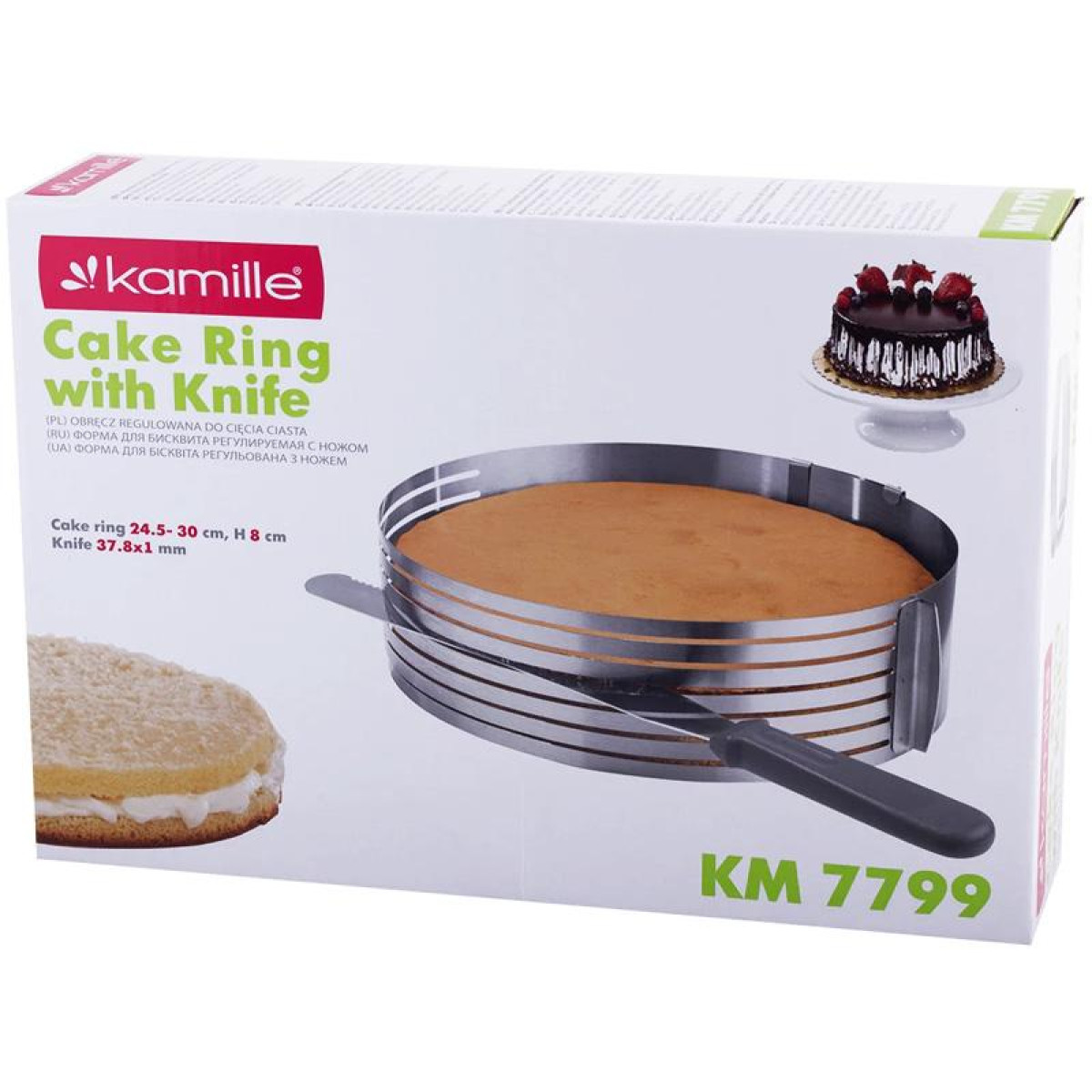 Форма Kamille для нарезки бисквита - удобное приспособление для ровного и красивого деления бисквита на коржи. Диаметр формы регулируемый - 24.5-33см, высота 8см. Толщина нарезанного теста 0.8см. Выполнена из пищевой нержавеющей стали. В комплекте нож с пластиковой ручкой. Длина ножа 37.8см, ширина лезвия 3см. Вы сможете легко разрезать бисквит на ровные тонкие коржи, которые быстро пропитаются кремом. Можно мыть в посудомоечной машине.