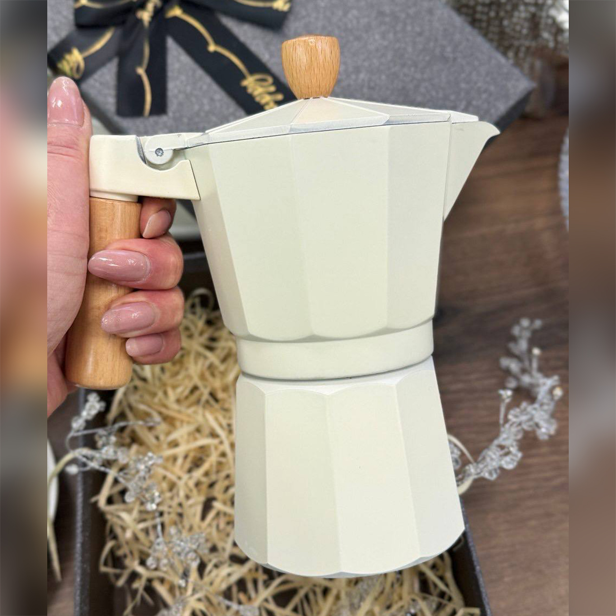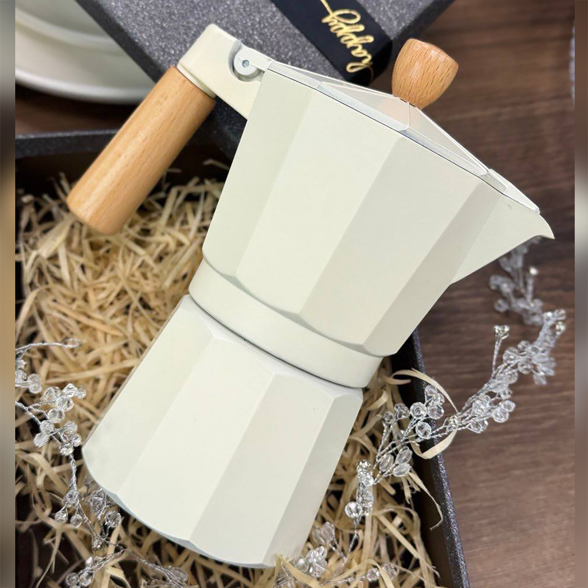 Гейзерна кавоварка Bergamo 300 мл, кольору слонової кістки з дерев’яною ручкою, на 6 чашок