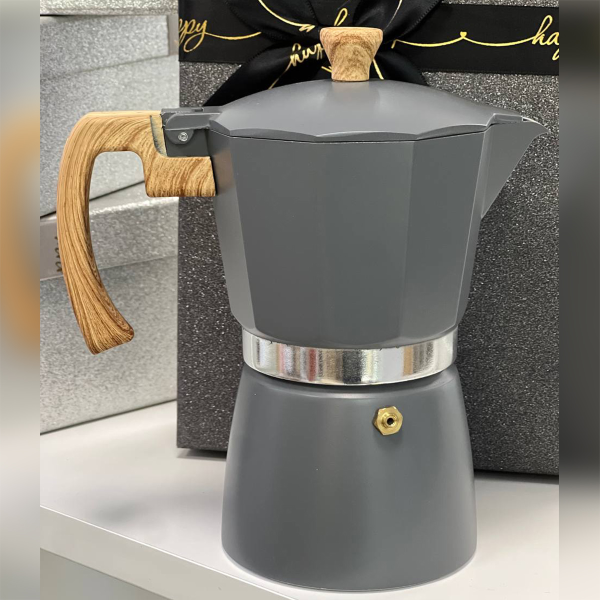 Гейзерна кавоварка Tuscany 300 мл, сірого кольору з дерев’яною ручкою, на 6 чашок