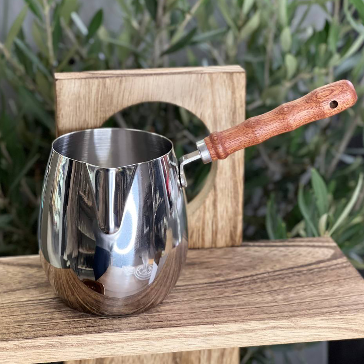 Турка Sidamo Wood — стильне рішення для приготування ароматної кави по-східному. Поєднання дзеркальної нержавіючої сталі та натуральної дерев’яної ручки створює естетичний і водночас практичний аксесуар для кухні.