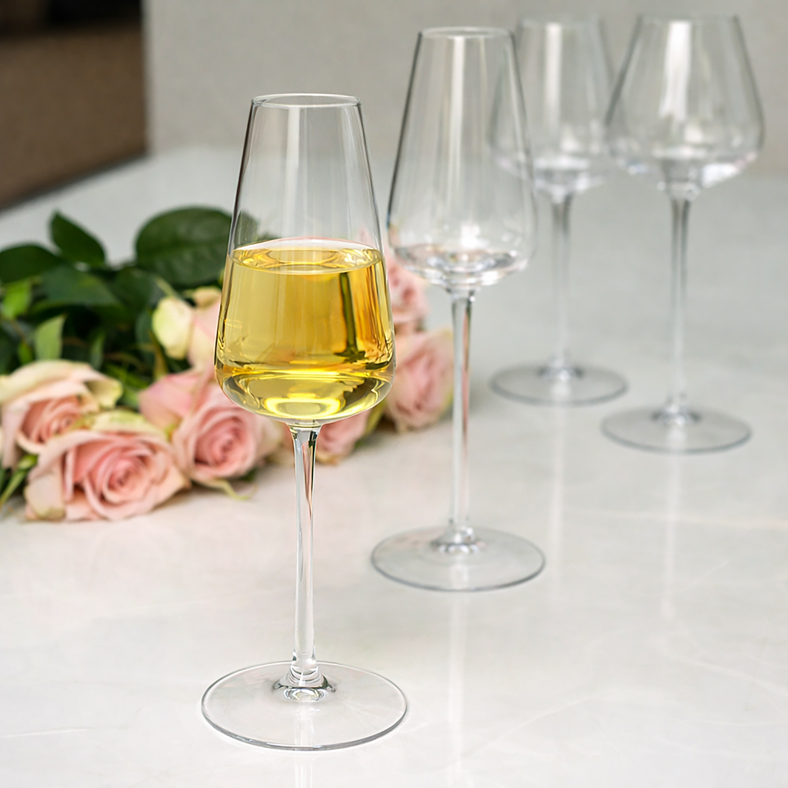 Придбання келихів у комплекті має безліч переваг. По-перше, це економія: набір бокалів для шампанського зазвичай обходиться дешевше, ніж купівля кожного окремо. По-друге, всі будуть виконані в одному стилі, що додасть застіллю гармонійного й естетичного вигляду.