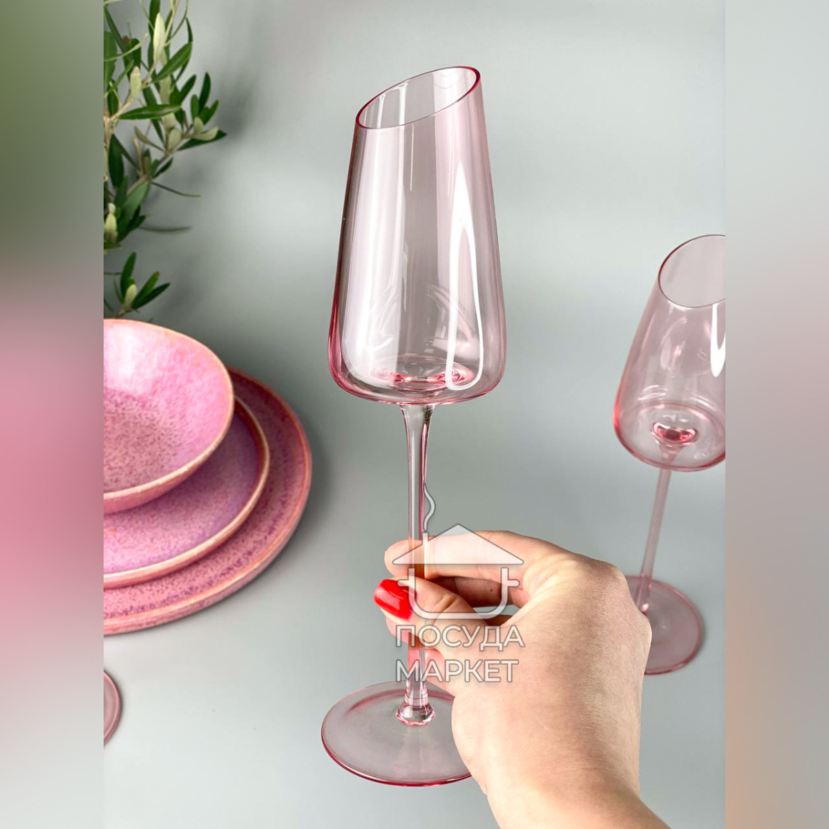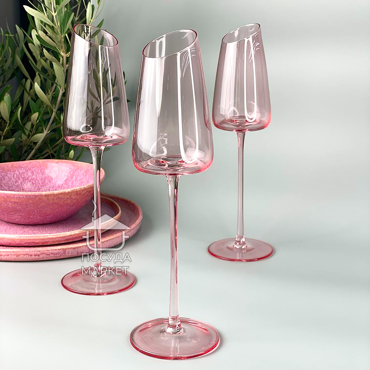 Набір 6 преміальних рожевих келихів для шампанського Style 200 мл із зрізаним верхом на високій ніжці, прозоре скло