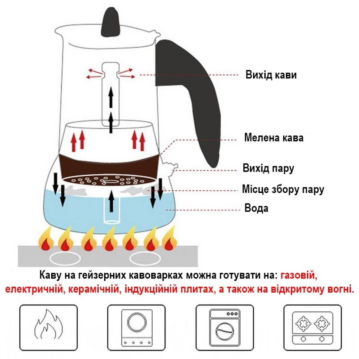 Особенностью таких гейзерных кофеварок является их удобство и быстрая заварка эспрессо прямо у вас дома. Вода, закипая, поднимается по специальной трубке через фильтр с молотым кофе и оседает в верхней емкости в виде чистого напитка. Приготовленный таким образом кофе лишен густоты и готов к подаче, обладая невероятным вкусом.