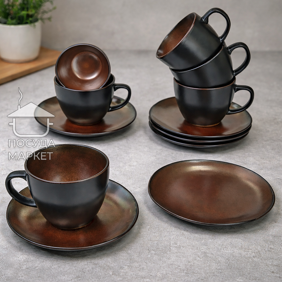 Чайный сервиз (набор) 6 чашек 410 мл с блюдцами из керамики Koper черно-коричневого цвета