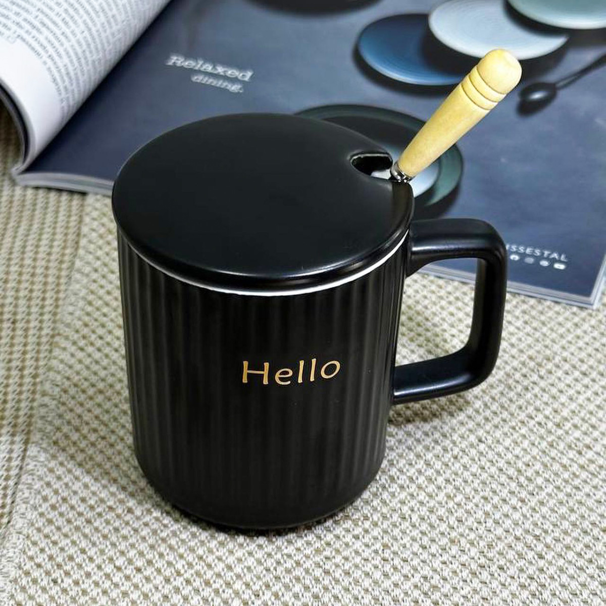 Кружка чорна керамічна «Вишуканий смак» 350мл з кришкою та ложкою