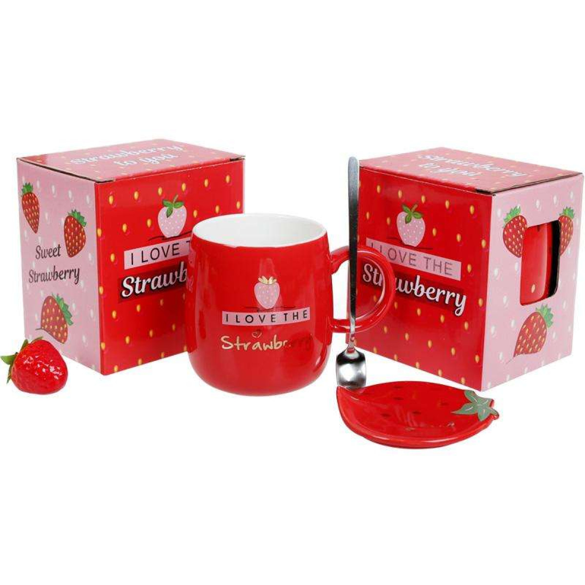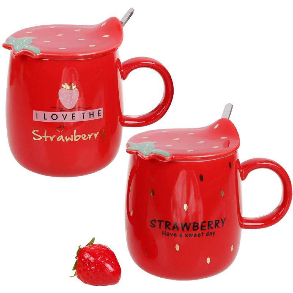 Кружка фарфорова Полуничка 420мл з кришкою і ложкою, червона