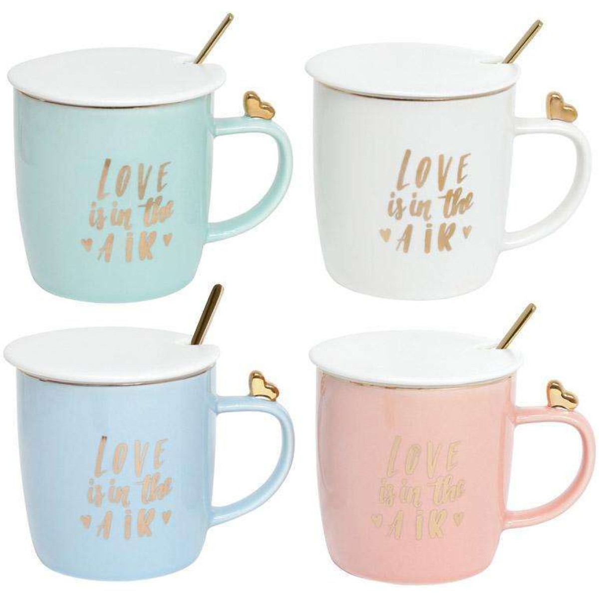 Кружка порцелянова Love is in the air - романтичний подарунок другій половинці до свята всіх закоханих - 14 лютого чи до важливої дати в житті двох закоханих. Об'єм, мл 375мл. У комплекті порцелянова кришечка і сталева ложка золотистого кольору. На вибір 4 кольори: бірюзовий, білий, блакитний або рожевий, з білими кришками. Напис Love is in the air (Любов у повітрі) і декоративне золотисте сердечко на ручці. Запакована в індивідуальну фірмову коробку.