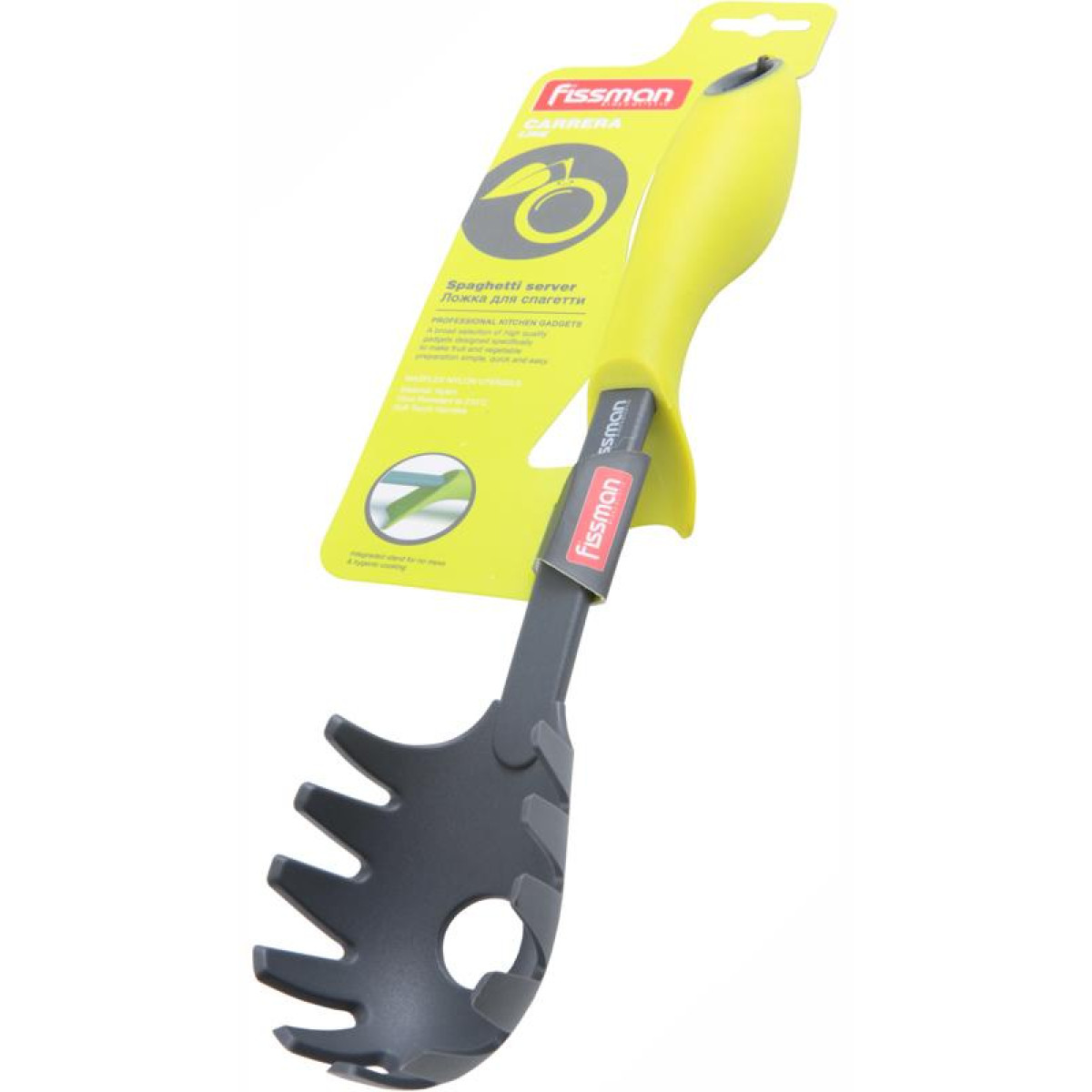Ложка для спагеті Fissman Carrera нейлонова. Підходить для роботи з посудом будь-якого типу, а особливо зручна в роботі з посудом з антипригарним покриттям, де важливо використовувати щадні аксесуари. Нейлон витримує температури до +210 градС, не змінюючи своїх якостей від контакту з гарячою поверхнею. Зручна ергономічна силіконова ручка, з нижнім міні-екраном для захисту рук. Розмір: 31,5х6,5см. Колір робочої частини: графітово-сірий, ручка: лимонно-жовта. Витягти з окропу макаронні вироби - без проблем.