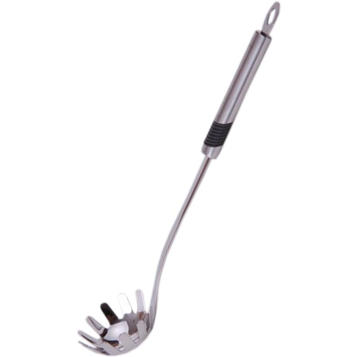 Ложка для спагеті Rebus від датської торгової марки Fissman - відмінний помічник, який на кухні творить дива. Тепер викладати спагеті в тарілки ще простіше. Довжина 34см. Виготовлена з якісної нержавіючої сталі 18/10 з глянцевою поверхнею для зручності догляду. Не забарвлюється і не вбирає запахи. Ручка сталева з чорною силіконовою декоративною вставкою. У ручці передбачене кільце для зручного зберігання або підвісу. Можна мити в посудомийній машині.