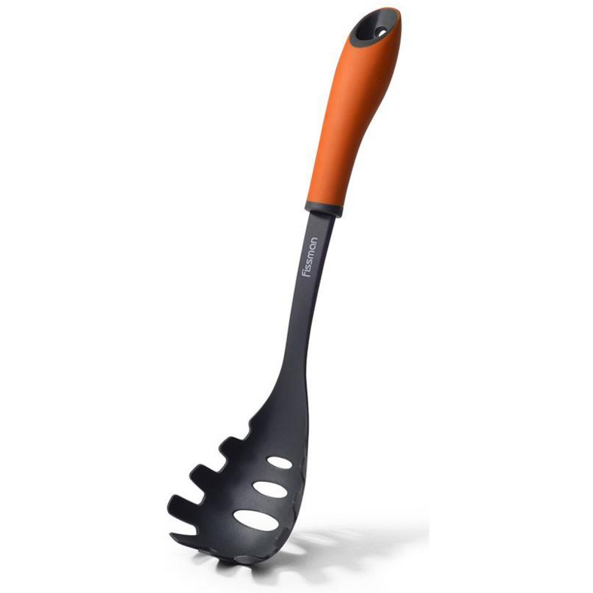 Ложка для спагетті Fissman Arabesque. Довжина 32см, ширина 8см. Робоча частина виготовлена з термостійкого нейлону і не дряпає антипригарне покриття. Матеріал не вбирає запахи, жир і бруд, легко миється в посудомийній машині. Не токсичний, не має запаху. Ложка має зручну м'яку рукоятку з силікону з нековзною поверхнею. Колекція Arabesque відрізняється стильним дизайном і функціональністю.