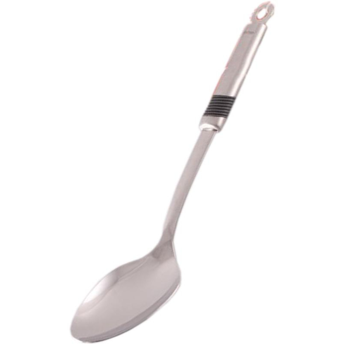 Ложка кухарська Rebus від датської торгової марки Fissman - відмінний помічник, який на кухні творить дива. Довжина 35см. Виготовлена з якісної нержавіючої сталі 18/10 з глянцевою поверхнею для зручності догляду. Не забарвлюється і не вбирає запахи. Ручка сталева з чорною силіконовою декоративною вставкою. У ручці передбачене кільце для зручного зберігання або підвісу. Можна мити в посудомийній машині.