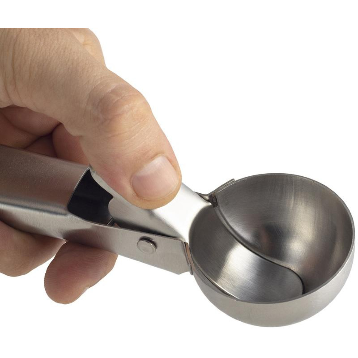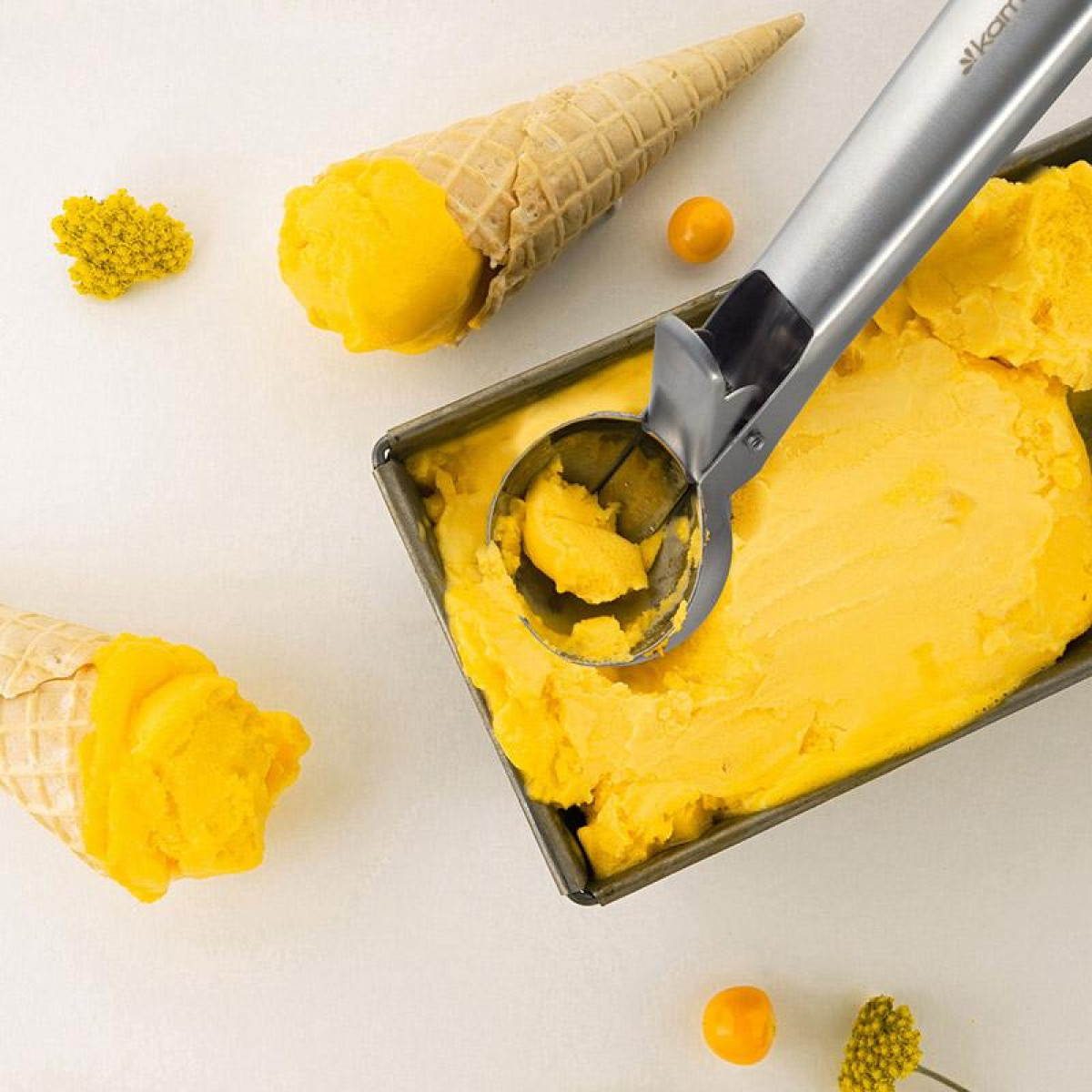Ложка для морозива Kamille з високоякісної харчової нержавіючої сталі (18/10) зі спеціальним виштовхувачем, який дозволить формувати акуратні кульки, а також легко їх виймати. Розмір: 18.5х5см. Призначений для розподілу морозива на порції та його естетичної подачі.