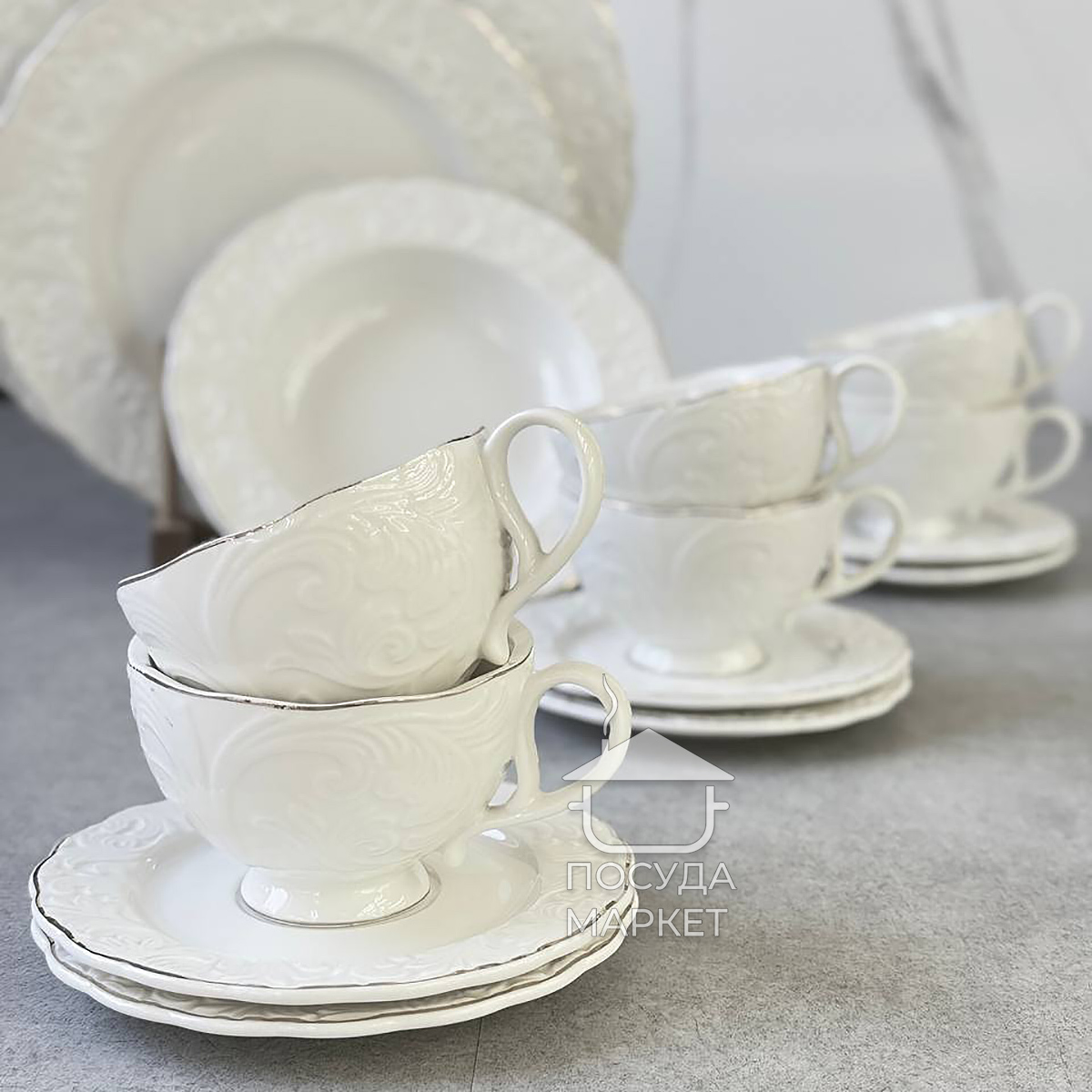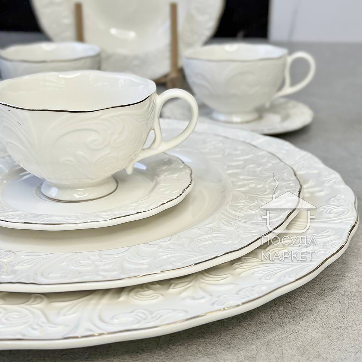 Чайний сервіз Ivory Elegance — це витончене поєднання класики та елегантності, яке стане окрасою будь-якого столу. Вишуканий рельєфний візерунок у поєднанні з ніжним відтінком слонової кістки та делікатною золотою окантовкою створює ефект розкішної, але стриманої подачі.