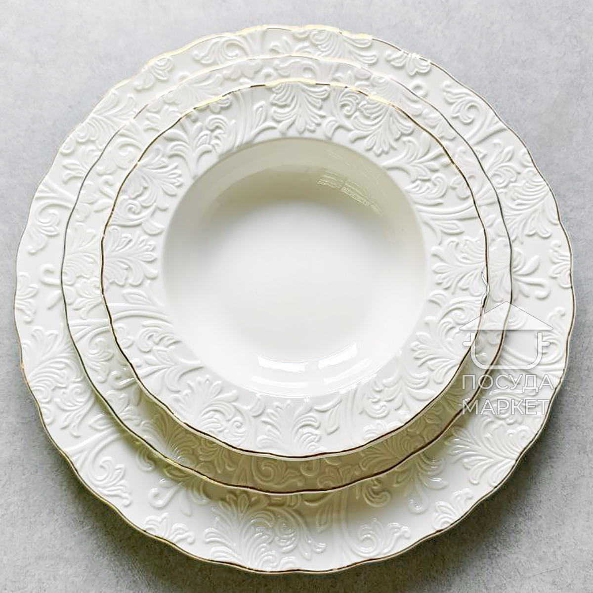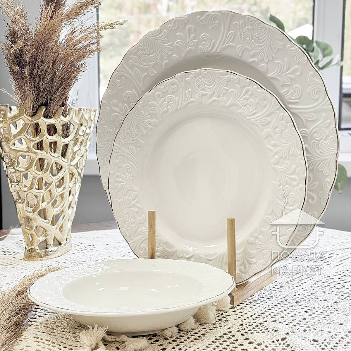 Виготовлений із якісної порцеляни, сервіз відзначається міцністю, довговічністю та приємною гладкою текстурою. Рельєфний декор додає глибини дизайну, підкреслюючи преміальний вигляд виробу.
