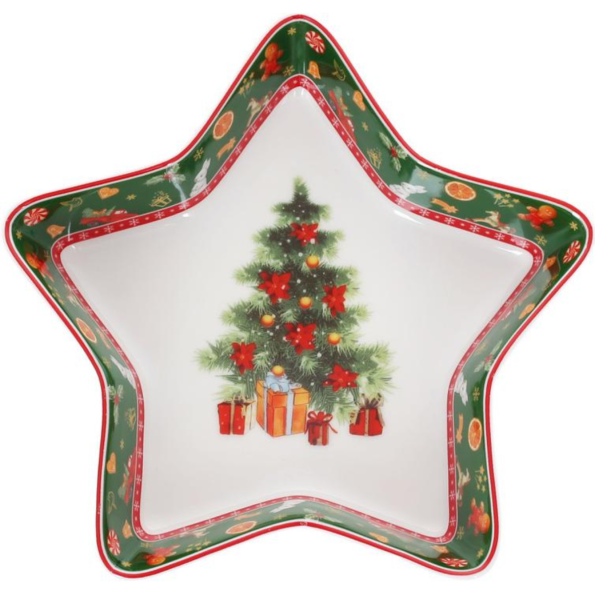Блюдо в форме звезды Елочка - яркая посуда для уютного и веселого рождественского стола. Размер: 17.5см. Блюдо изготовлено из белого фарфора с рисунком елочки в центре, по краям - зеленая кайма. Блюдо имеет форму звездочки. Оно послужит отличным подарком к Рождественским праздникам или к Новому Году. Наилучшая идея оригинального позитивного и практичного подарка в период зимней сказки.