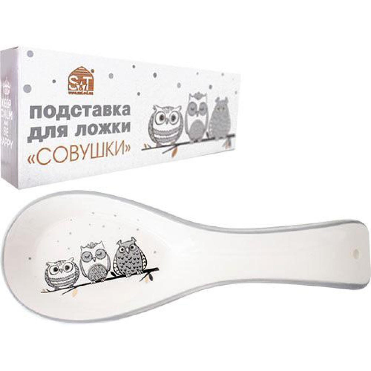 Керамическая подставка под ложку Be Happy «Совушки». Совушки - современный тренд. Белая керамика и контрастный рисунок совушек в серых оттенках. Коллекция керамической посуды Be Happy Owl - это сочетание трендового дизайна и милоты в одном предмете. Длина 23см, высота 2.5см. Подставка упакована в фирменную коробку.