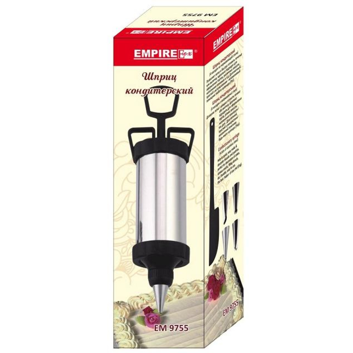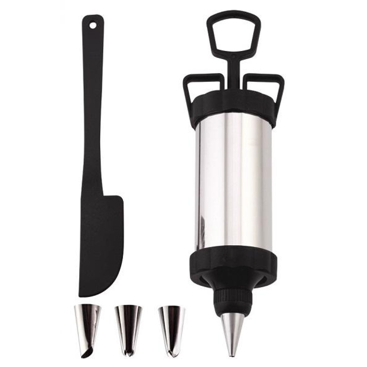Шприц кондитерский поршневой с 4 насадками. Емкость и насадки из нержавеющей стали. В комплекте нож для теста, также может использоваться для укладки печенья на противень для выпечки. Размер шприца: длина 22см, диаметр 4,5см, лопатка: 18,5х2,5см. Упакован в фирменную упаковку.