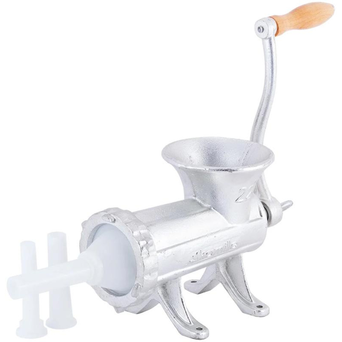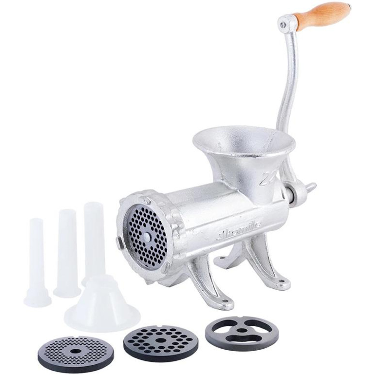 | Комплектация | 1 мясорубка, 4 внутренние насадки, 3 насадки для наполнения колбас, 1 кривошип, 1 ручка, 1 зажим |