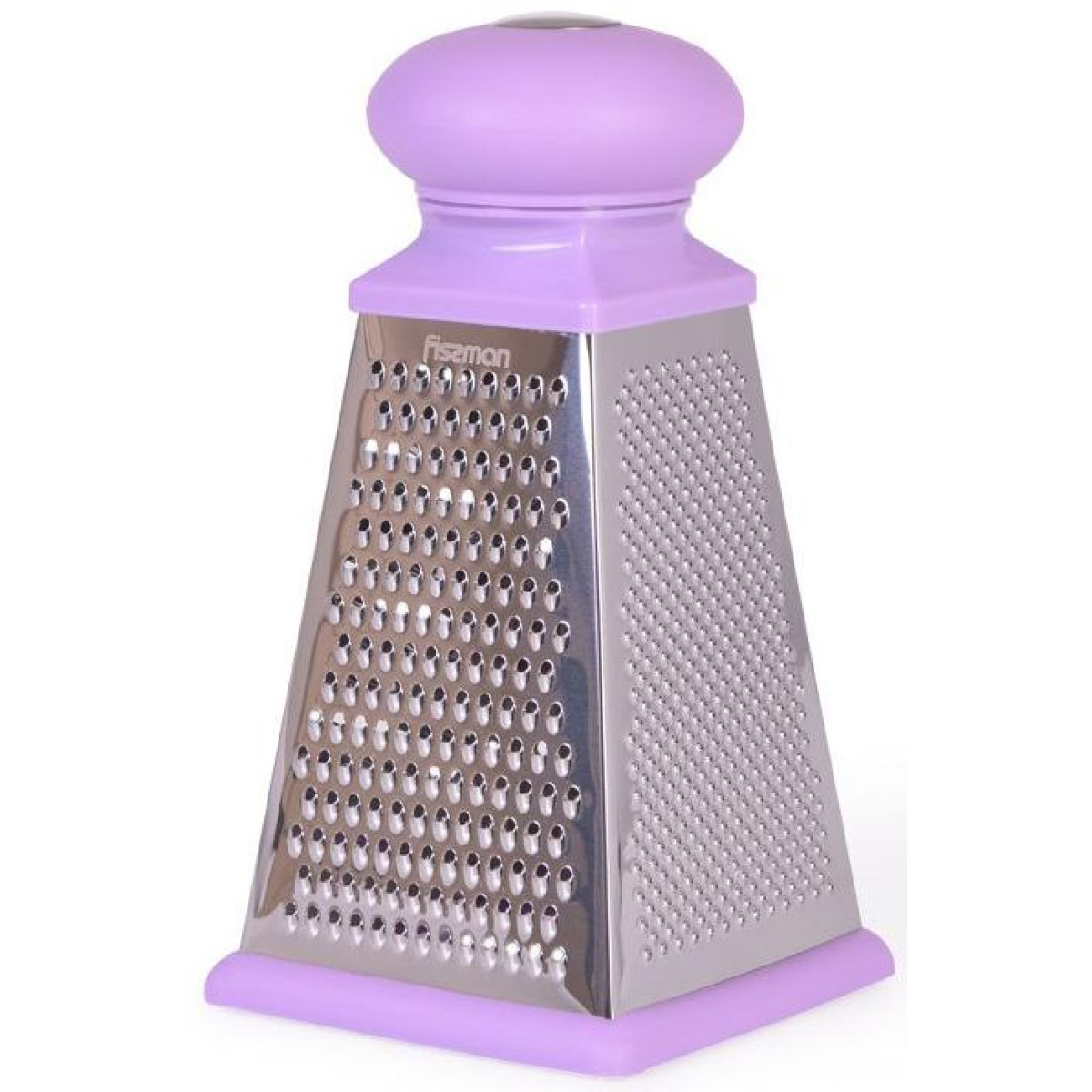 Терка 4-х гранная Fissman Meotida Pyramida. Рабочая поверхность выполнена из нержавеющей стали. Твердая прочная пластина не прогибается даже во время измельчения твердых продуктов. 4 типа лезвий - крупная терка, средняя, мелкая и шинковка. Пластиковая ручка приятная на ощупь. Удобно располагается в руке и не выскальзывает, что очень важно при работе с острыми лезвиями терки. Съемный силиконовый протектор на основании для защиты от скольжения. Цвет на выбор: салатовый или сиреневый. Высота 21см основание 12.5см.
