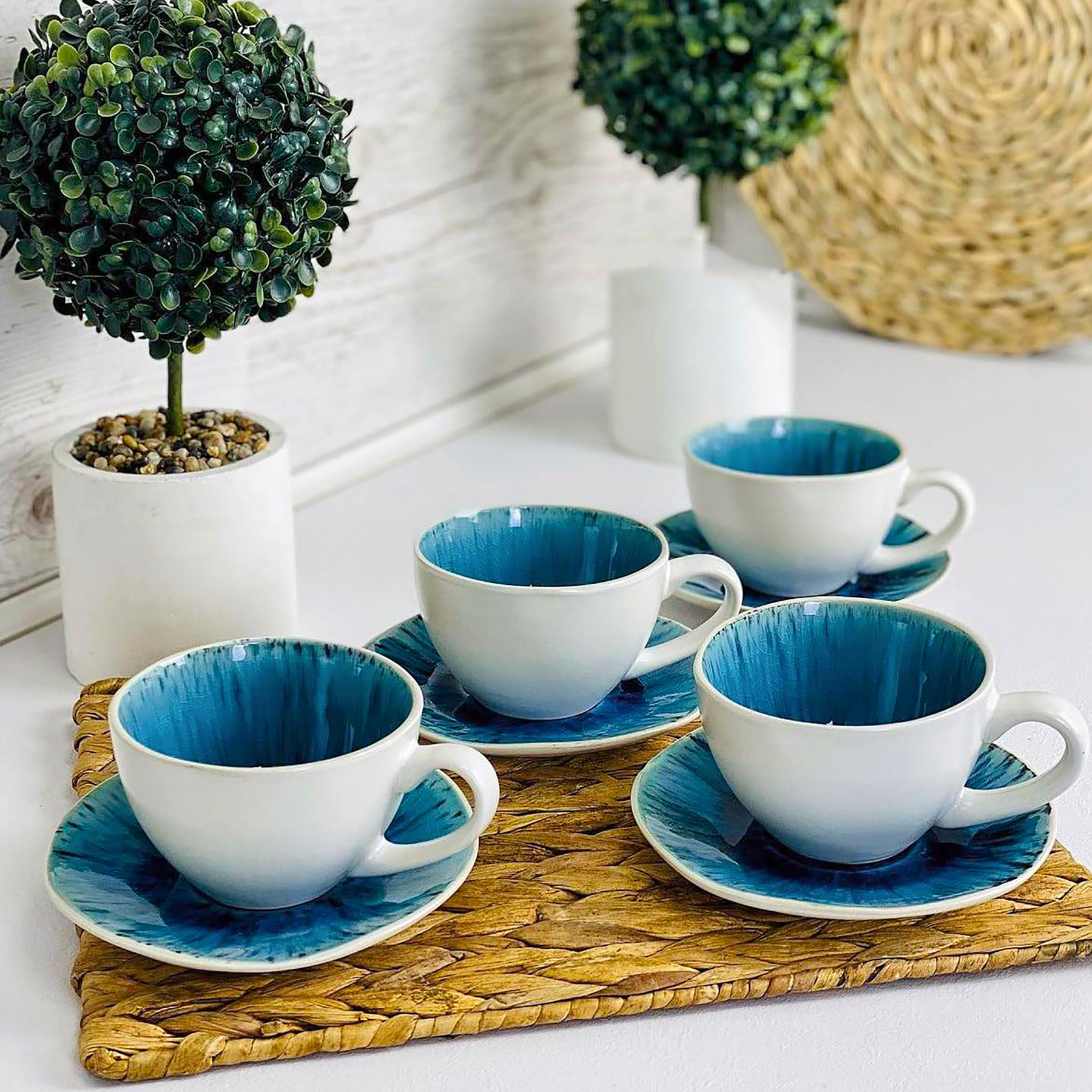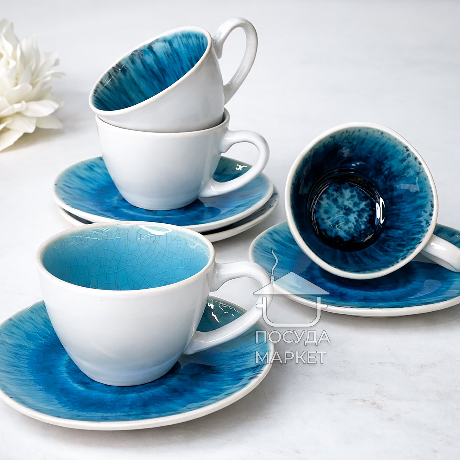 Чайний сервіз (набір) Scandium 250 мл 4 чашки із блюдцями блакитного кольору, білі зовні JM0141LT