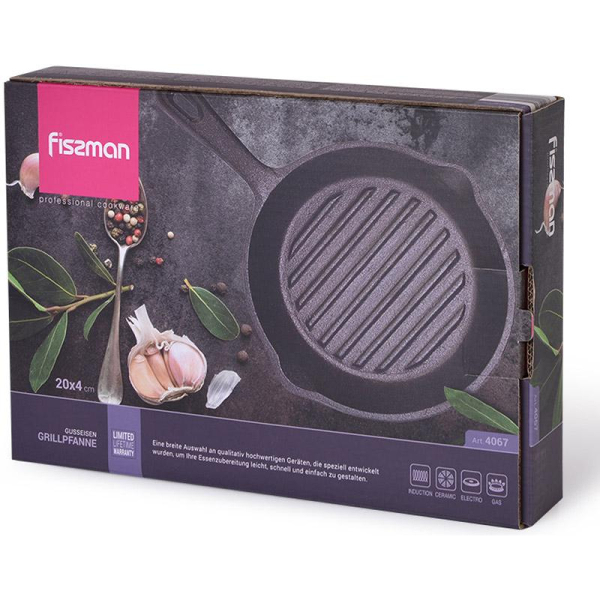 Сковорода-гриль Fissman Naestved круглая, диаметр 18см, глубина 4см. Изготовлена из чугуна, самого надежного и долговечного материала. Такая посуда абсолютно безопасна для здоровья, хорошо проводит и удерживает тепло. Имеет естественные антипригарные свойства, которые стойки к механическим воздействиям и позволяют пользоваться металлическими аксессуарами. Дно рифленое, что обеспечивает минимальный контакт продуктов с поверхностью сковороды. С такой особенностью дна можно готовить даже без использования масла и на большем огне. За счет кратковременной тепловой обработки пища сохраняет все витамины и полезные свойства. Благодаря ребристому дну мясо не жарится в своем жиру. С обеих сторон сковороды носики для удобного слива лишнего жира и жидкости. Ручка чугунная литая, сковороду можно использовать в духовом шкафу. Дно индукционное, подходит для использования на всех видах плит, в том числе индукционных.