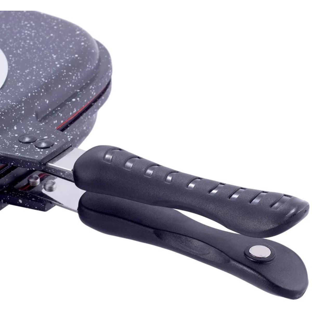 Сковорода-гриль двухсторонняя Kamille Grill Pan – залог приготовления вкусной и здоровой пищи. Механизм приготовления состоит в том, что кусочки еды не требуется переворачивать с помощью кулинарных лопаток, а просто перевернуть сковороду гриль. Две части сковороды плотно прилегают друг к другу, между ними имеется силиконовая прокладка, которая предотвращает потерю тепла и протекания жидкости. За счет такой герметичности еда готовится в собственном соку и существенно быстрее, при этом сохраняет все свои полезные свойства, цвет и аромат. Сковорода изготовлена из литого алюминия, что обеспечивает быстрый нагрев и равномерное распределение тепла. Такой материал и конструкция посуды, сэкономит до 35% процентов энергии. Внутри 3-слойное мраморное антипригарное покрытие. Размеры 32х24см, глубина 7.5см. Две ручки выполнены в черном цвете с бакелитовым покрытием, не нагреваются и не скользят в руках и надежно прикреплены к корпусу сковороды. Сковородка незаменима для поджаривания стейка и овощей-гриль. Гриль сковородка двухсторонняя Kamille подходит для стеклокерамических, газовых и электрических плит, а также ее удобно мыть в посудомоечной машине.