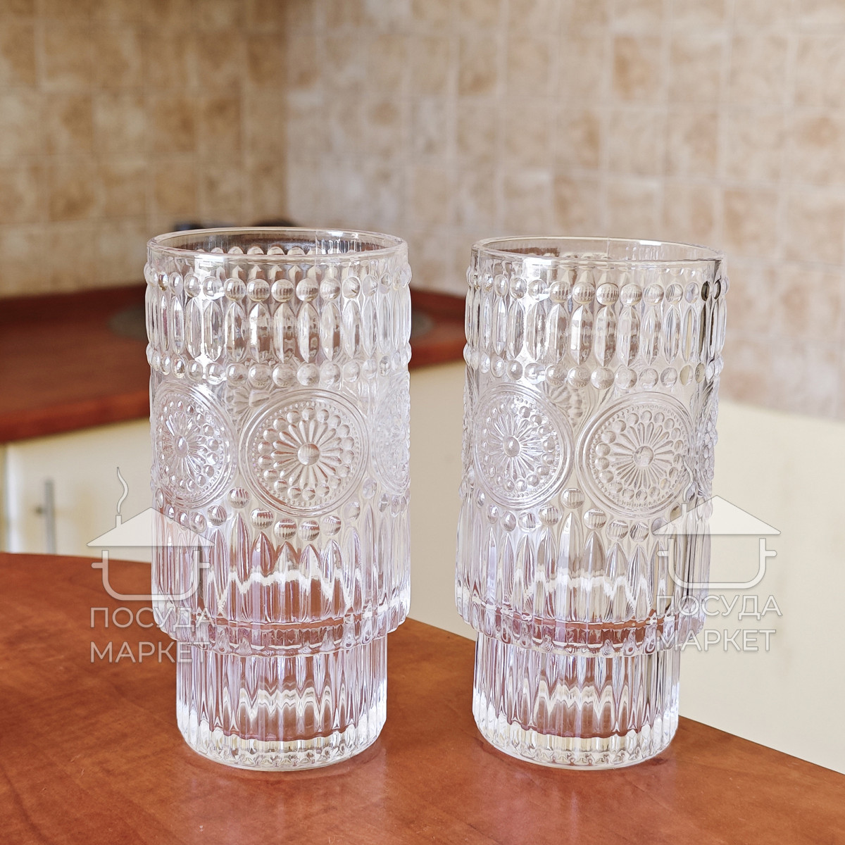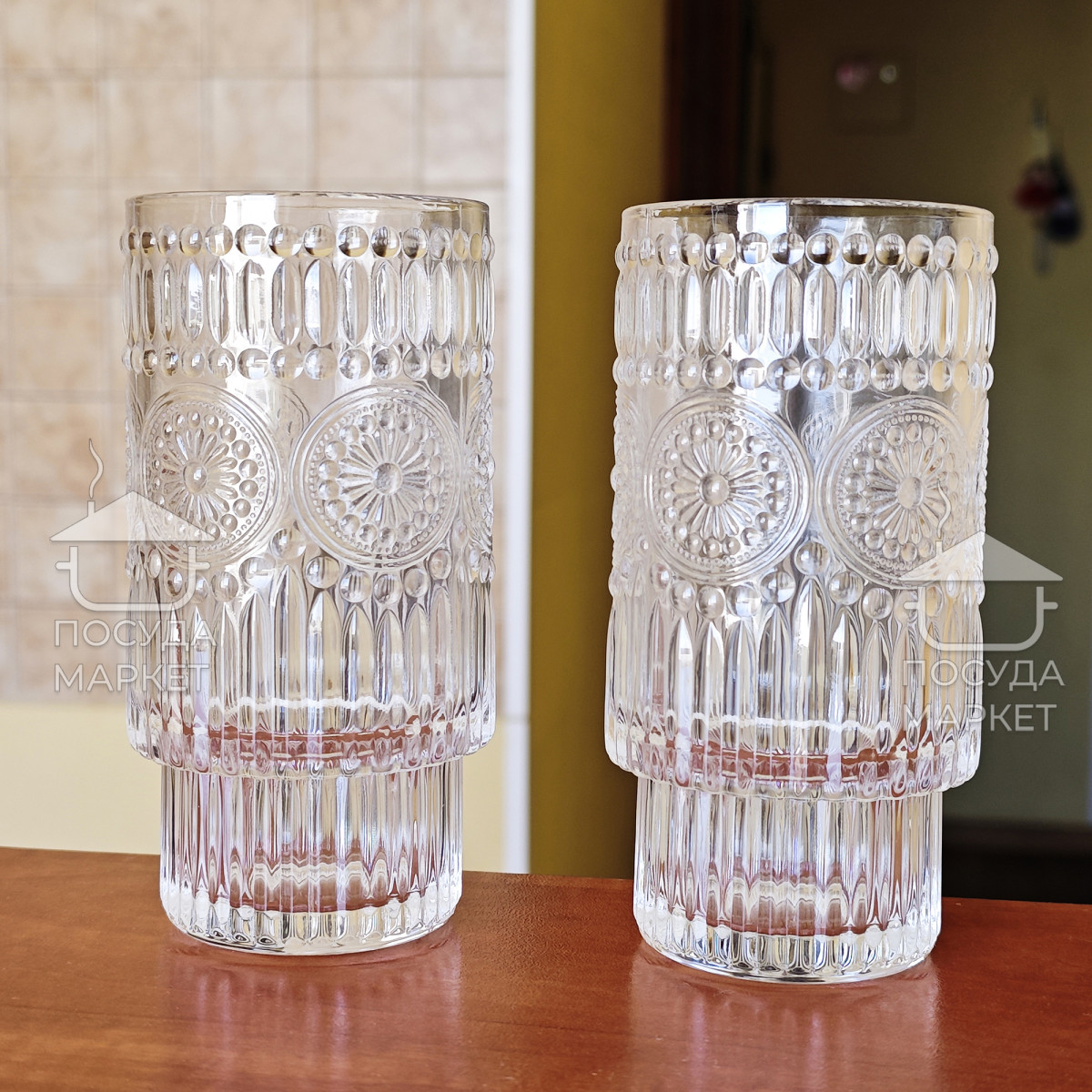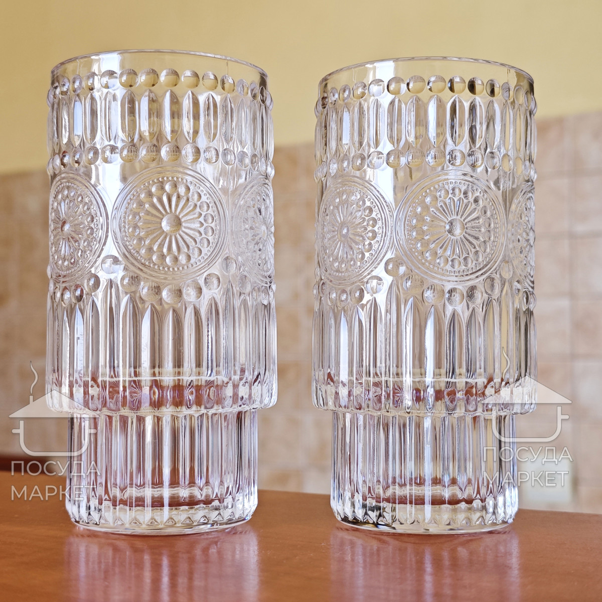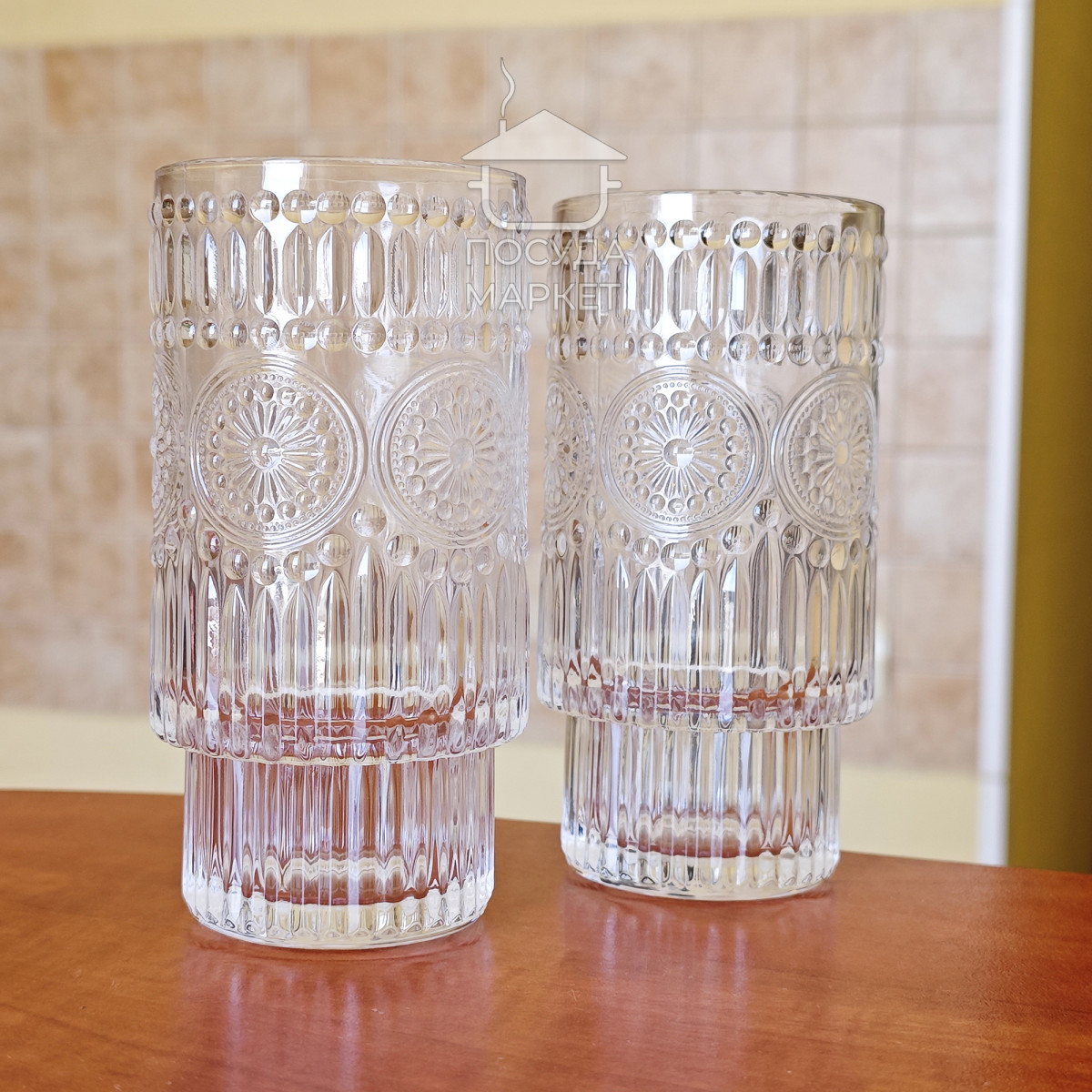 Набор 6 фигурных высоких больших стаканов 300 мл Itali с прозрачного стекла с фактурным рисунком