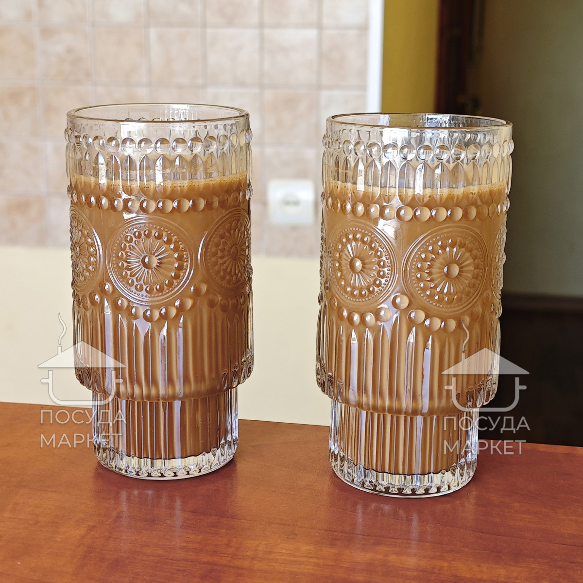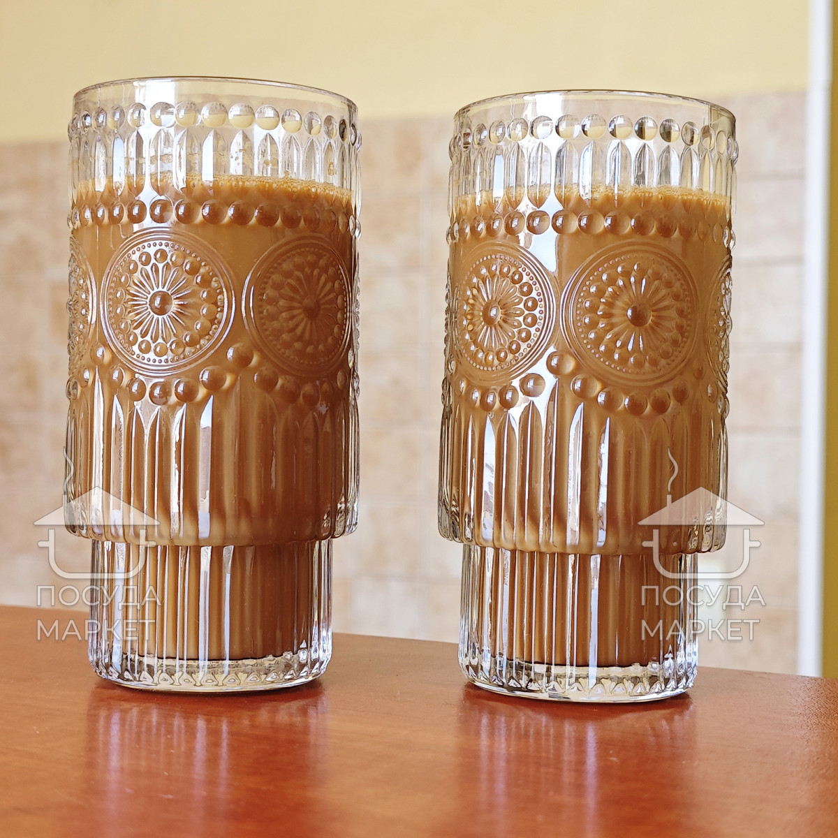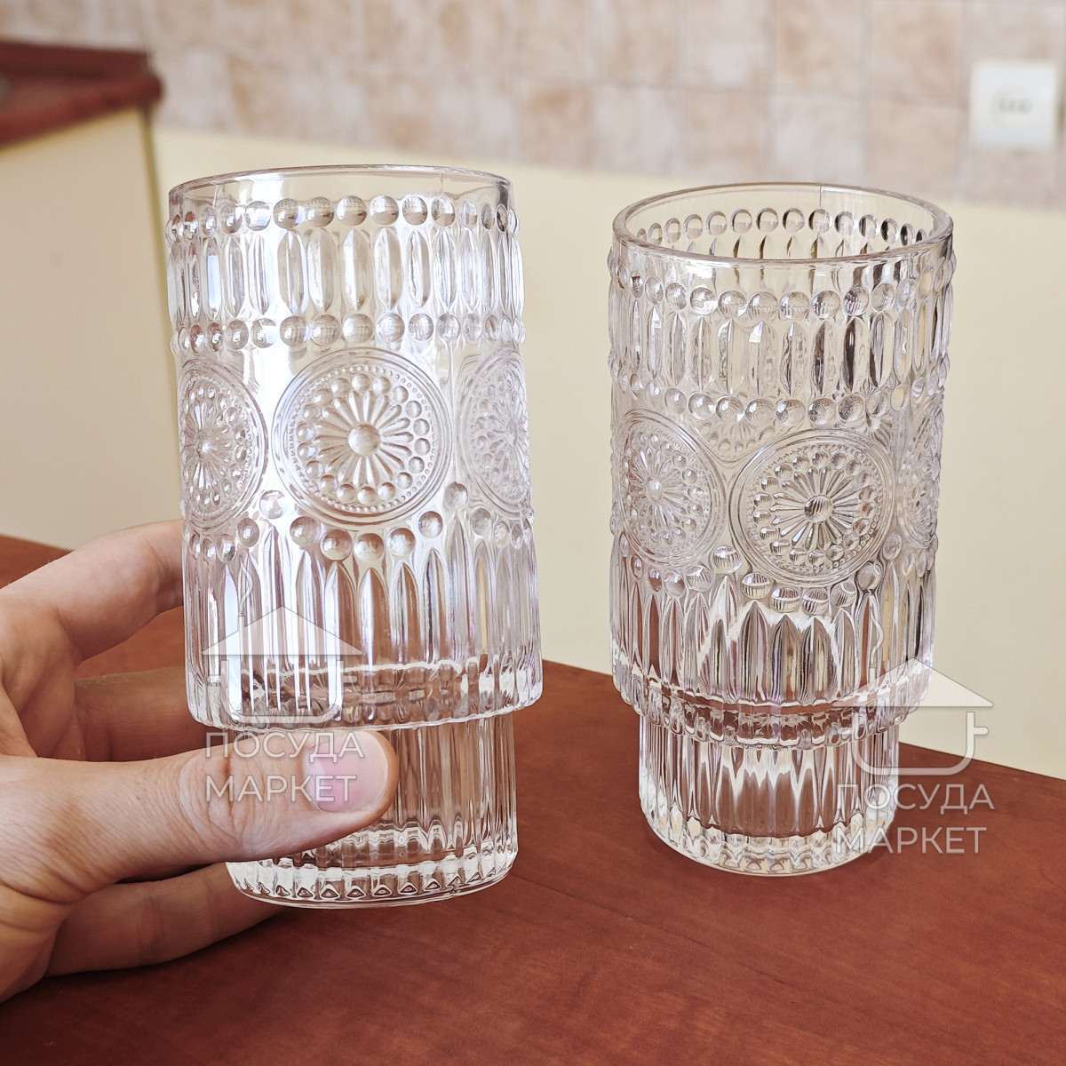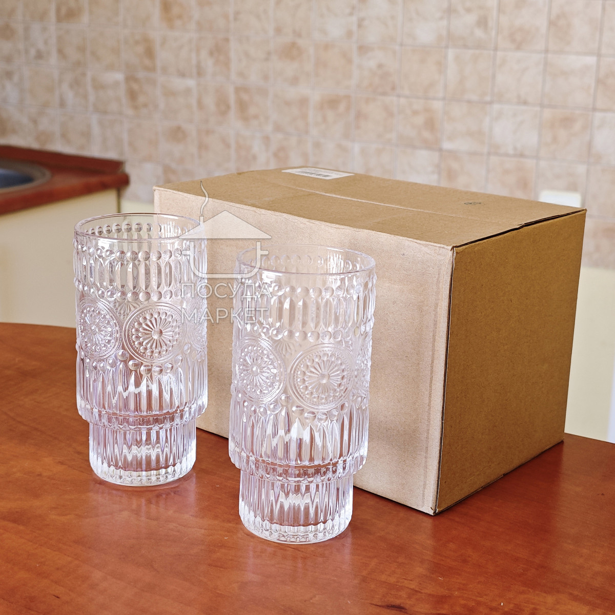 Набор 6 фигурных высоких больших стаканов 300 мл Itali с прозрачного стекла с фактурным рисунком