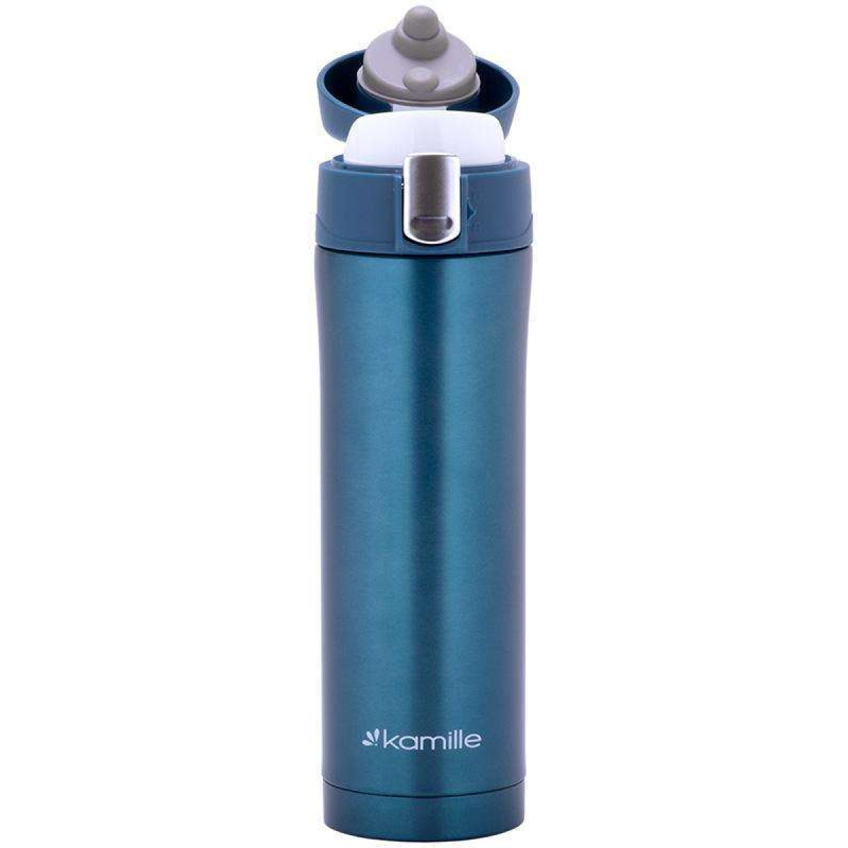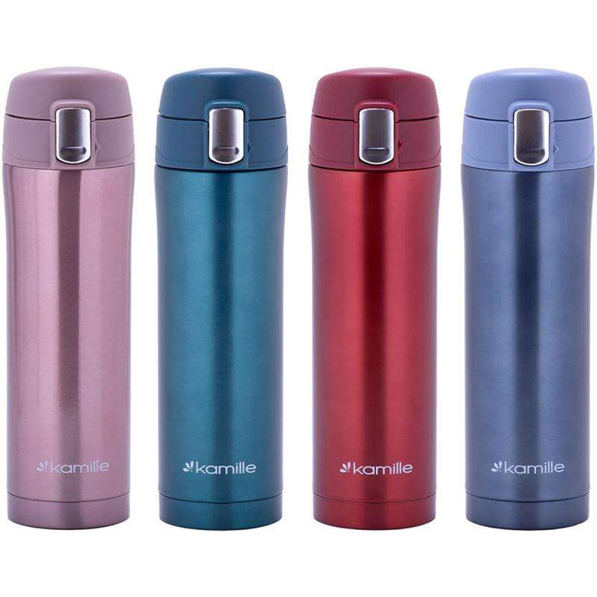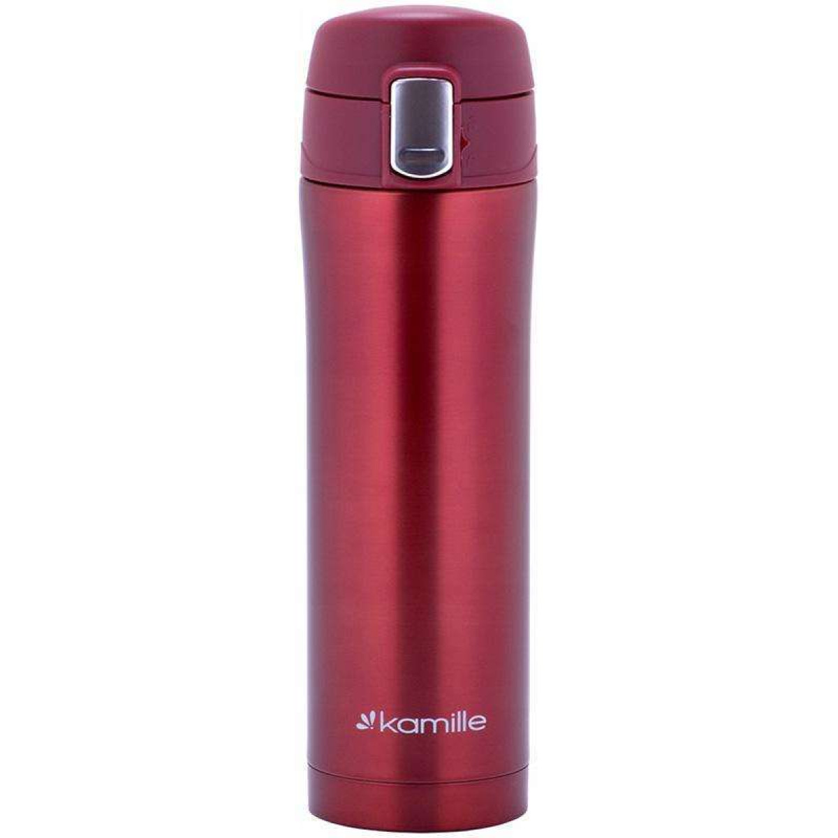 Термос (термокружка) Kamille Marigee, Об'єм, мл 450мл. Корпус і внутрішня колба виконані з нержавіючої сталі. Гігієнічний матеріал, відмінно підходить для транспортування гарячих і холодних напоїв, не вимагає особливого поводження. Термокружка з нержавіючої сталі стійка до механічних пошкоджень, колба не виділяє шкідливих речовин при контакті з рідинами, не має запаху. Пластикова кришка на різьбі з додатковою відкидною кришкою і поїлкою. Термос можна використовувати як термокружку, пити улюблені напої, не відкриваючи його повністю і не випускаючи температуру. Стильний дизайн - кольоровий сталевий корпус. Колір на вибір: синій, червоний, смарагдовий або рожевий. Висота термоса 23.5см.