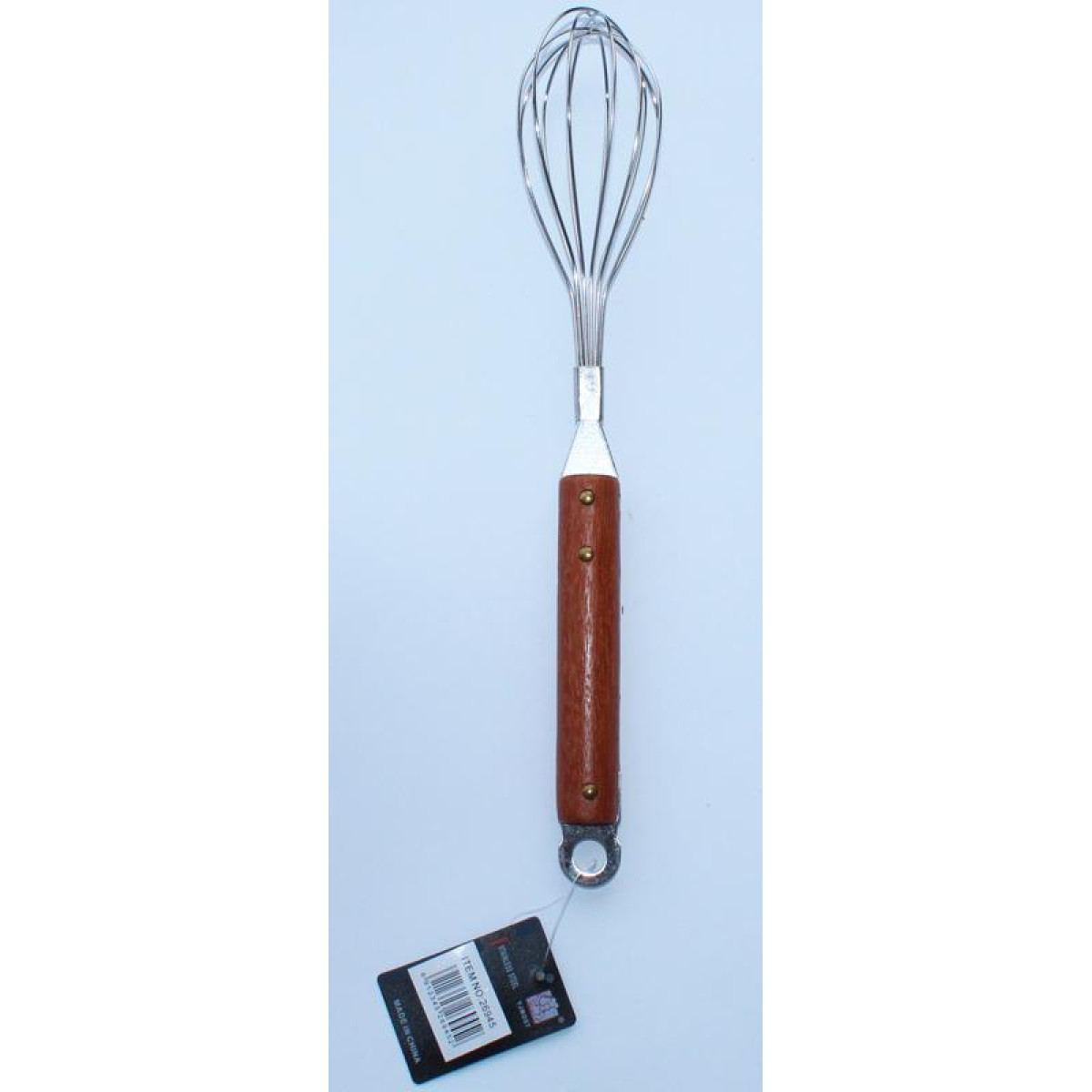 Віничок YJMOST від компанії Dynasty. Виготовлений з високоякісної нержавіючої сталі з глянсовим поліруванням. Розмір з ручкою - 31см, ручка- 14.5см, діаметр віночка - близько 6см. Міцний і якісний кухонний аксесуар для професійного і домашнього використання. Ручка з натурального дерева, темна. На ручці спеціальне кільце - Віничок зручно зберігати і підвішувати. Віничок YJMOST можна мити в посудомийній машині.